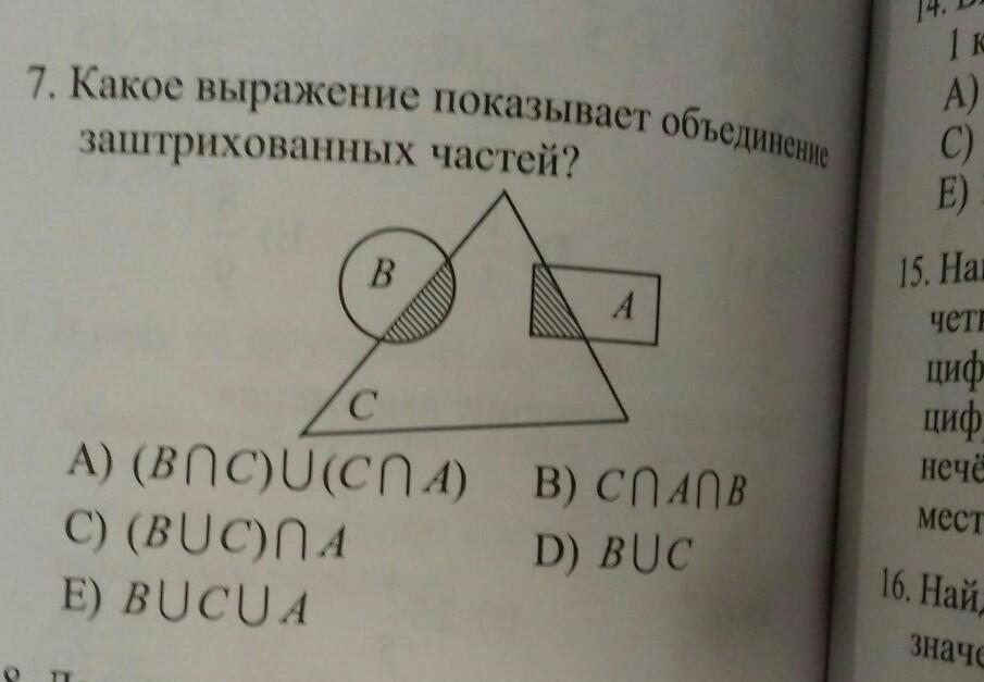 Заштрихованная часть с участием круга и треугольника получается только пересечением B∩C. Заштрихованная часть с участием треугольника и прямоугольника получается только пересечением C∩A. Тогда вся заштрихованная часть получается объединением