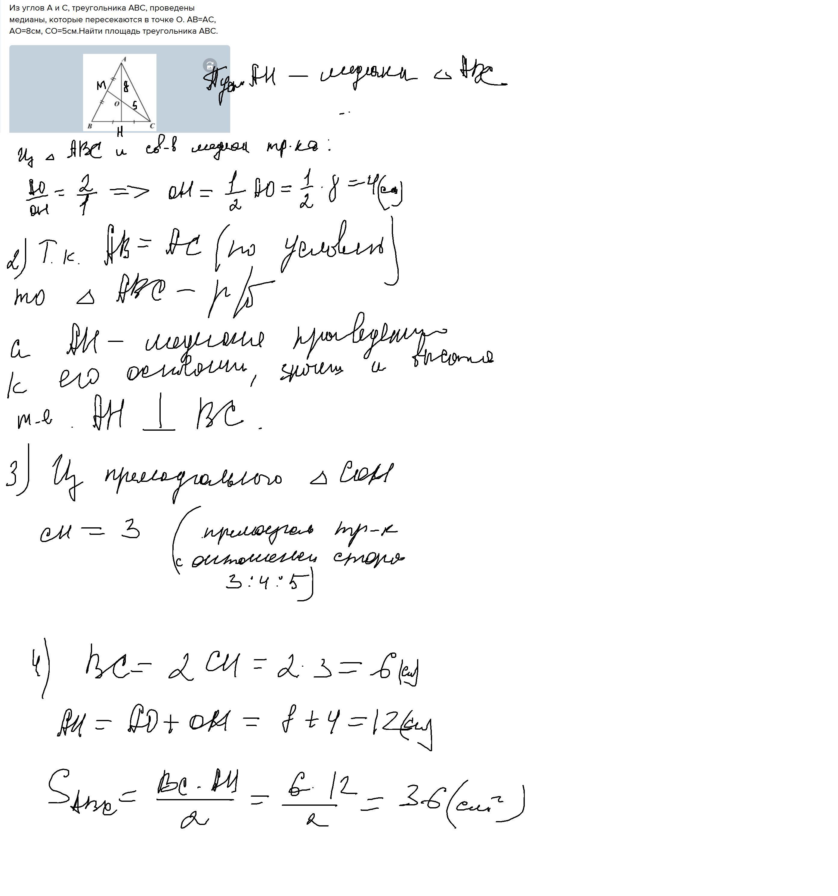 Из углов А и С, треугольника АВС, проведены медианы, которые пересекаются в точке О. АВ=АС, АО=8см, СО=5см.Найти площадь треугольника АВС.