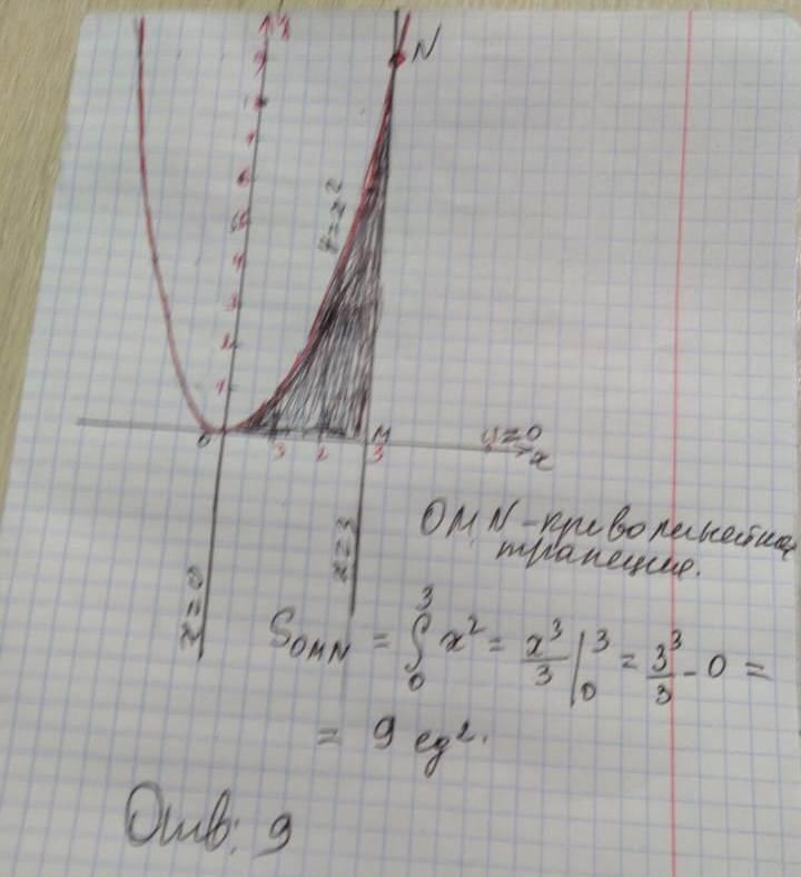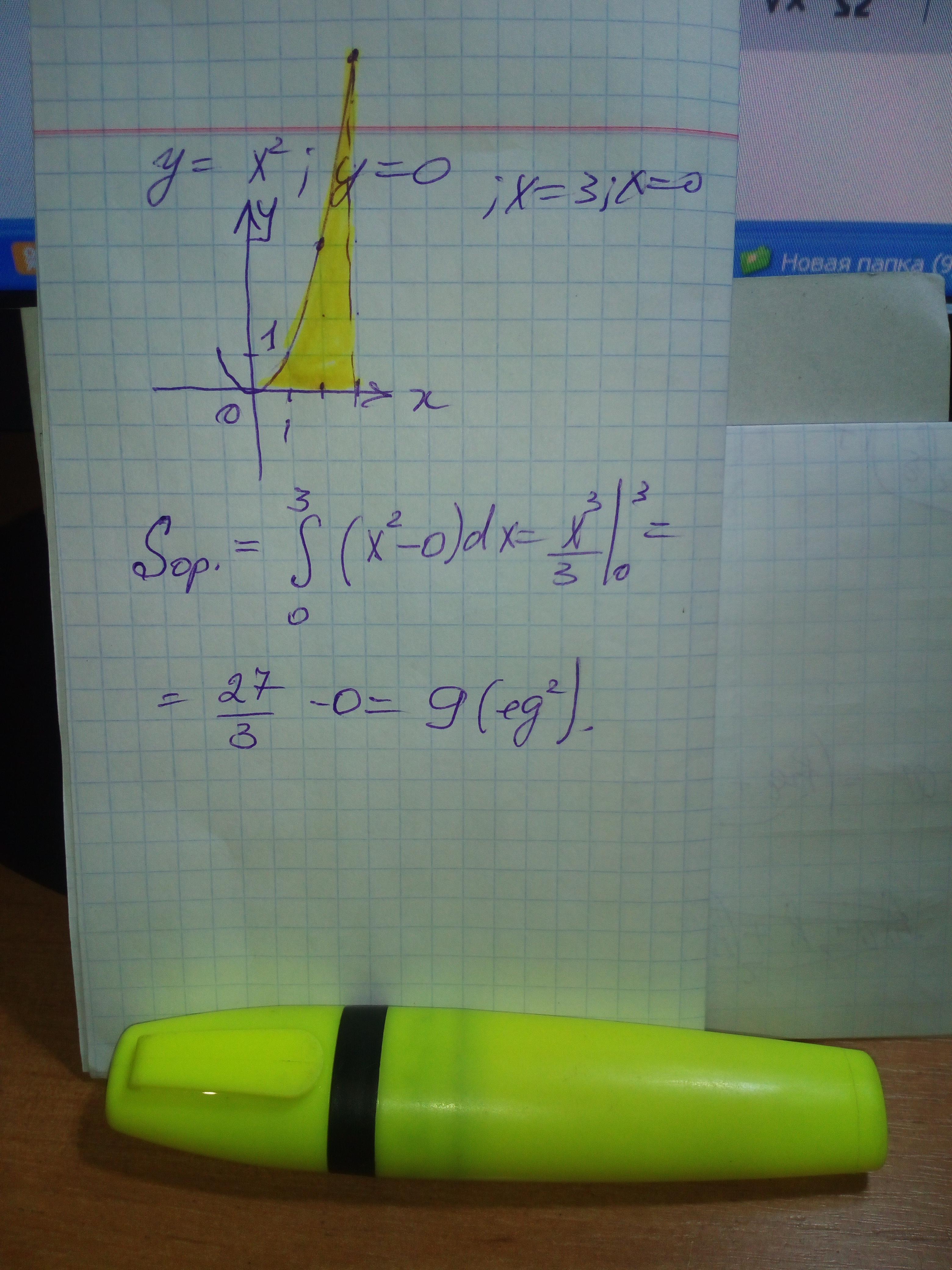 Помогите решить. Вычислите площадь криволинейной фигуры, ограниченной линиями y=x^2,y=0,x=3,x=0.