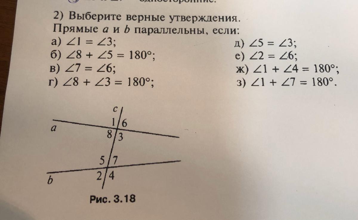 Прямые параллельны, если сумма односторонних углов равна 180°(под буквой б), если соответственные углы равны (под буквой в), и если накрест лежащие углы равны ( под буквой д)