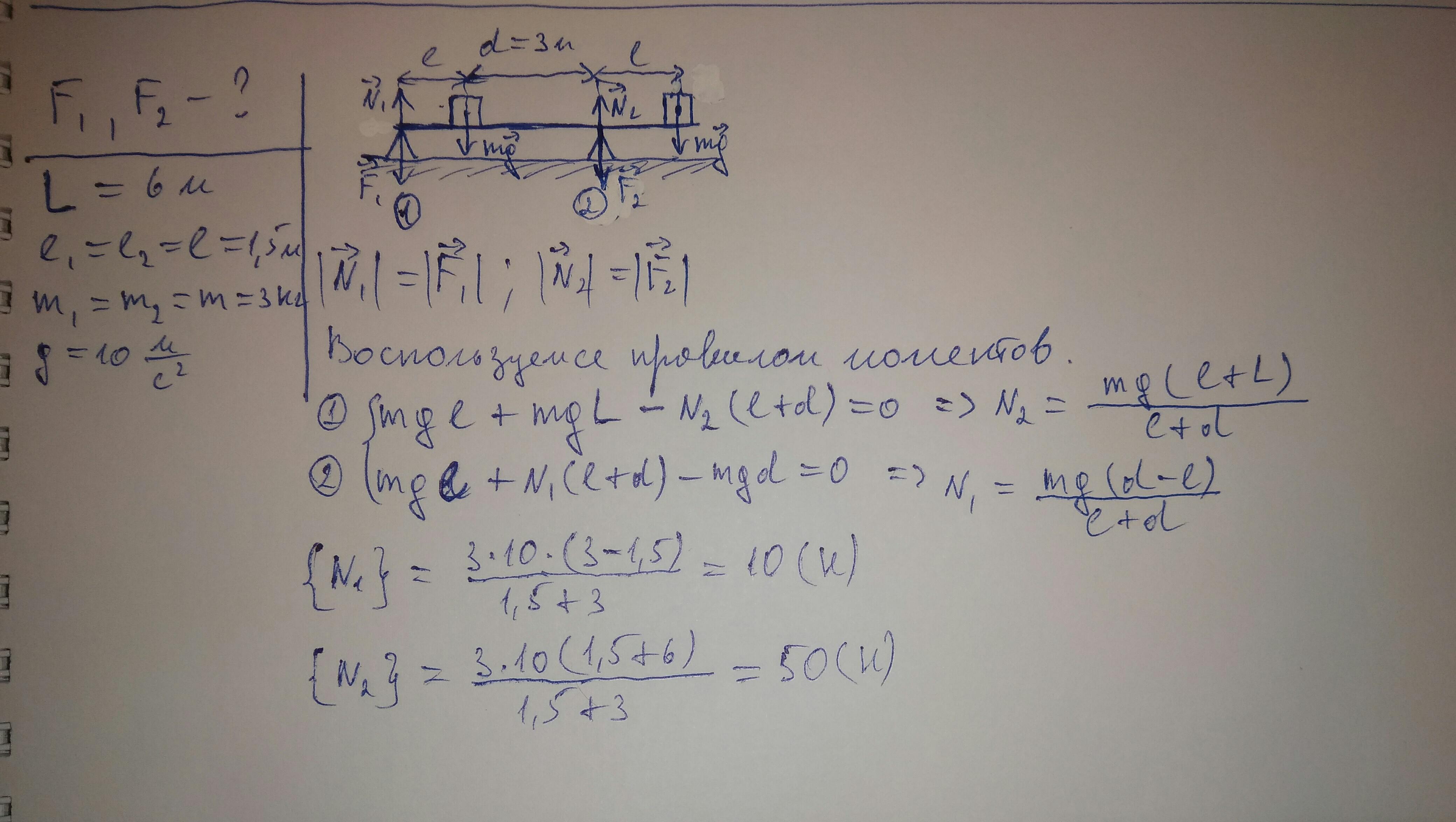 Балка длиной 6 м лежит на двух опорах. На балке находятся два груза массой 3 кг каждый (см. рис.). Масса самой балки пренебрежимо мала. Ускорение свободного падения g=10м/с2.