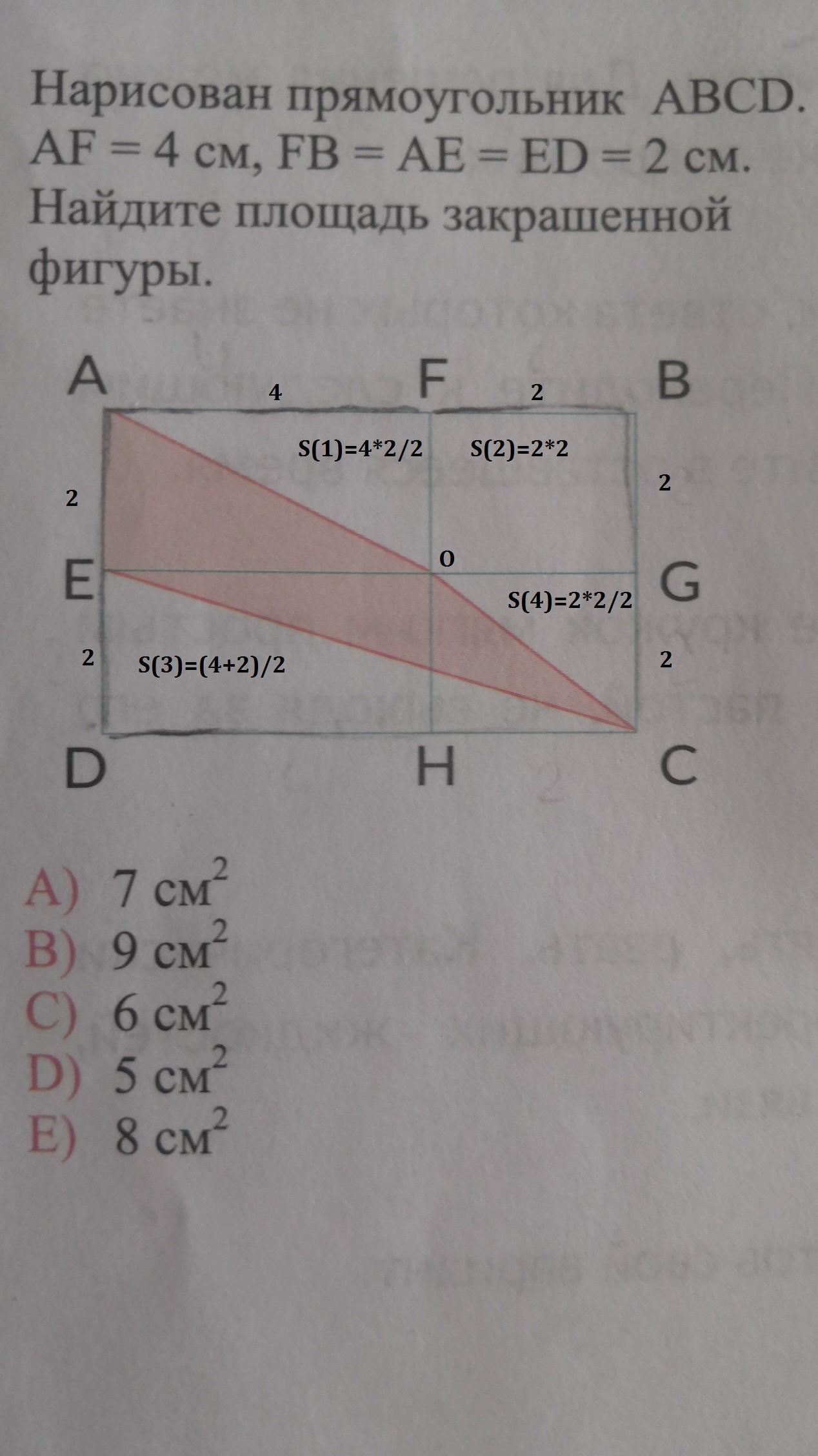 2) ∆AEO прямоугольный, S1 = 1/2•AE•EO = 1/2•2•4 = 4 (см^2).