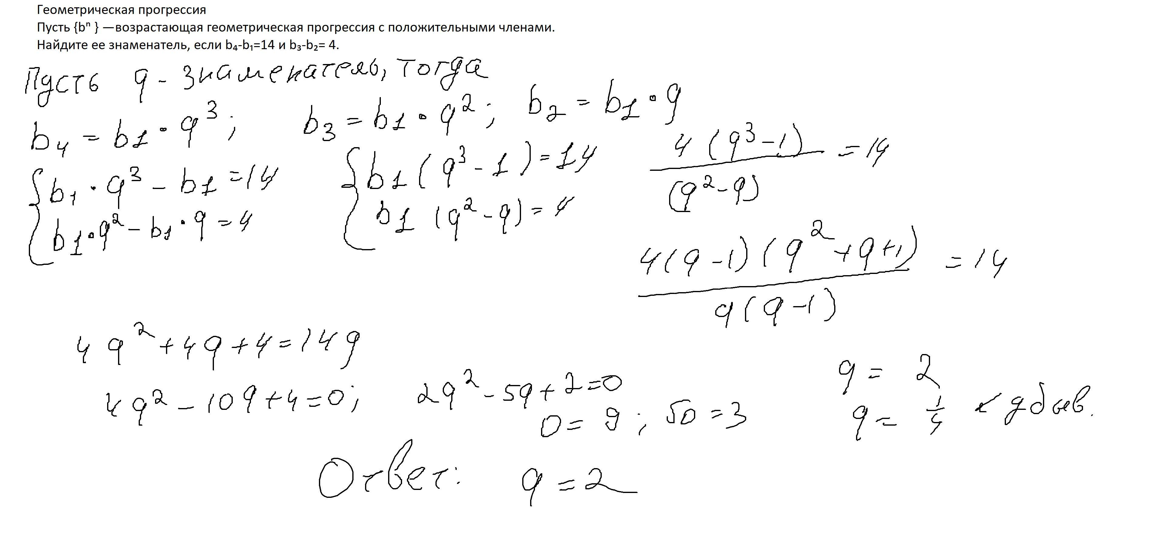 Найдите ее знаменатель, если b₄-b₁=14 и b₃-b₂= 4.