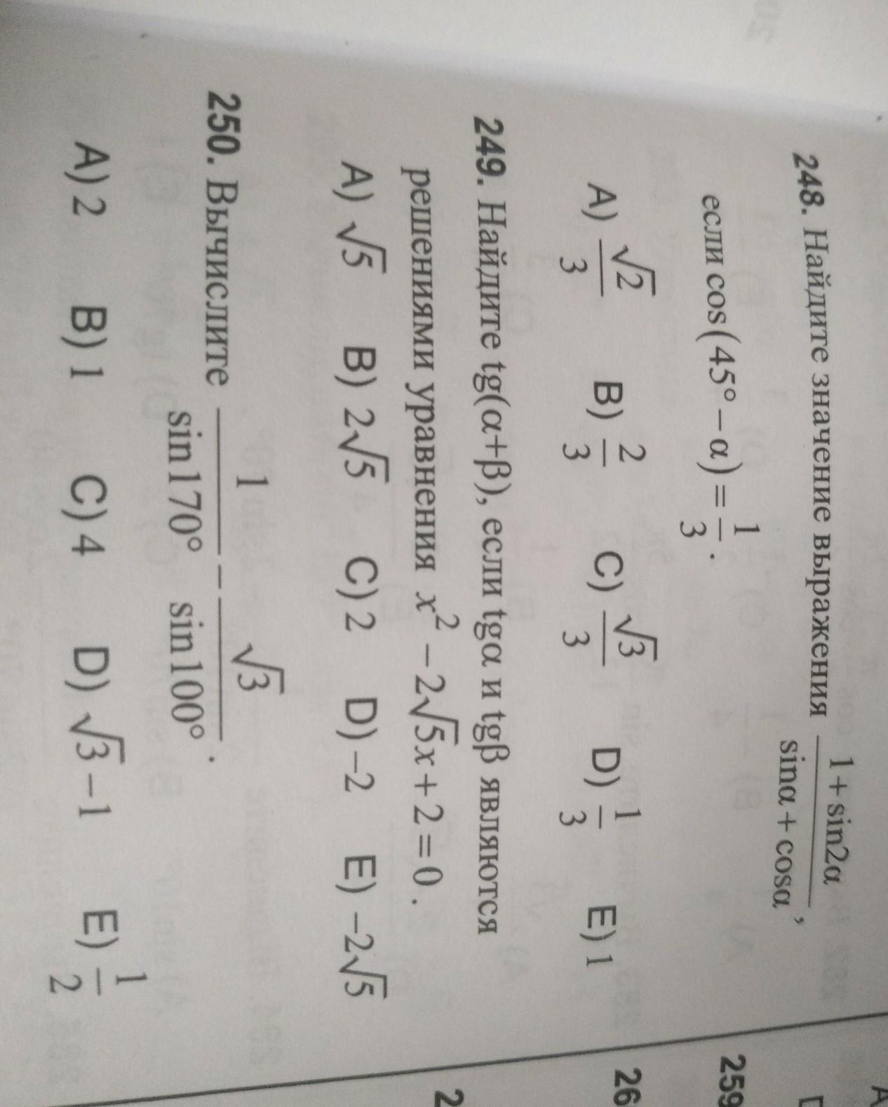 248.\; \; \; \; cos(45^\circ -a)=\frac{1}{3}\; \; \Rightarrow \\\\cos45^\circ \cdot cosa+sin45^\circ \cdot sina=\frac{1}{3}\\\\\frac{\sqrt2}{2}\cdot cosa+\frac{\sqrt2}{2}\cdot sina=\frac{1}{3}\; \; \to \; \; \; \frac{\sqrt2}{2}\cdot (cosa+sina)=\frac{1}{3}\; \to \\\\sina+cosa=\frac{\sqrt2}{3}\\\\(sina+cosa)^2=\frac{2}{9}\\\\\underbrace {sin^2a+cos^2a}_{1}+\underbrace {2\, sina\cdot cosa}_{sin2a}=\frac{2}{9}\\\\1+sin2a=\frac{2}{9}\\\\\frac{1+sin2a}{sina+cosa}=\frac{2}{9}:\frac{\sqrt2}{3}=\frac{2\cdot 3}{9\cdot \sqrt2}=\frac{\sqrt2}{3}