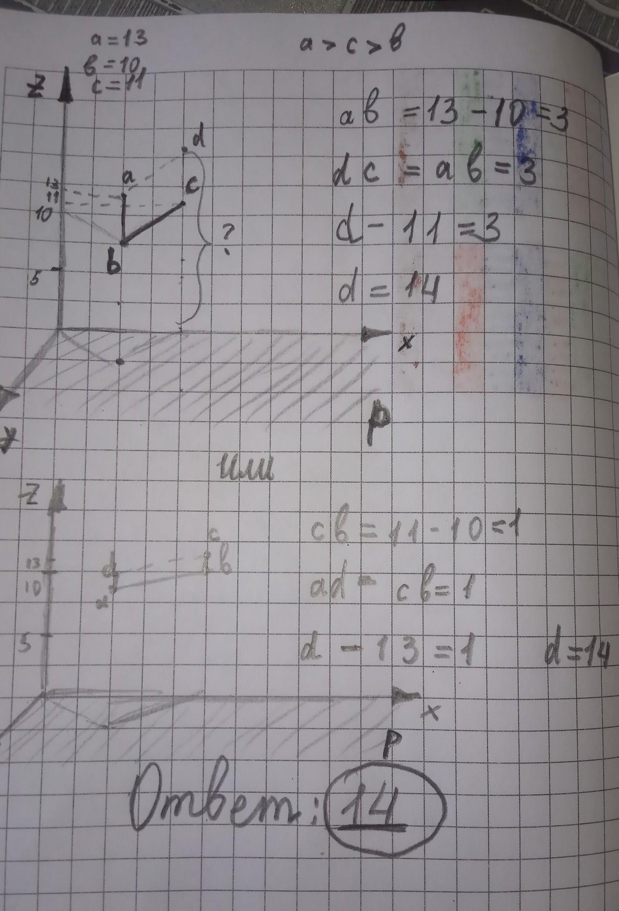 В пространстве дан параллелограмм abcd. точки a b c находятся на расстояниях 13, 10 и 11 соответственно над некоторой горизонтальной плоскостью p . вычислите расстояние от вершины d до плоскости p.
