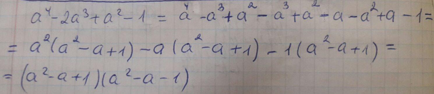а*4-2а*3+а*2-1=а*2(а*2-2а+1)-1=а*2(а-1)*2-1=(а(а-1))*2-1=(а(а-1)-1)(а-1)+1)=(а*2-а-1)(а*2-а+1)