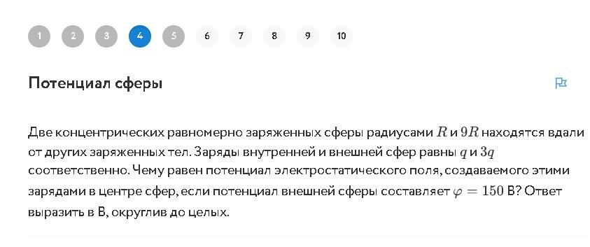 Потенциал внутри обеих сфер постоянный, равный потенциалу на поверностях, т.е. от внешней сферы с учетом условия Ф1=150В=к*3q/9R, откуда k*q/R= 3*150= 450В= Ф2 -потенциал внутренней сферы. Тогда по принципу суперпозиции суммарный потенциал в центре Фц=150+450= 600В