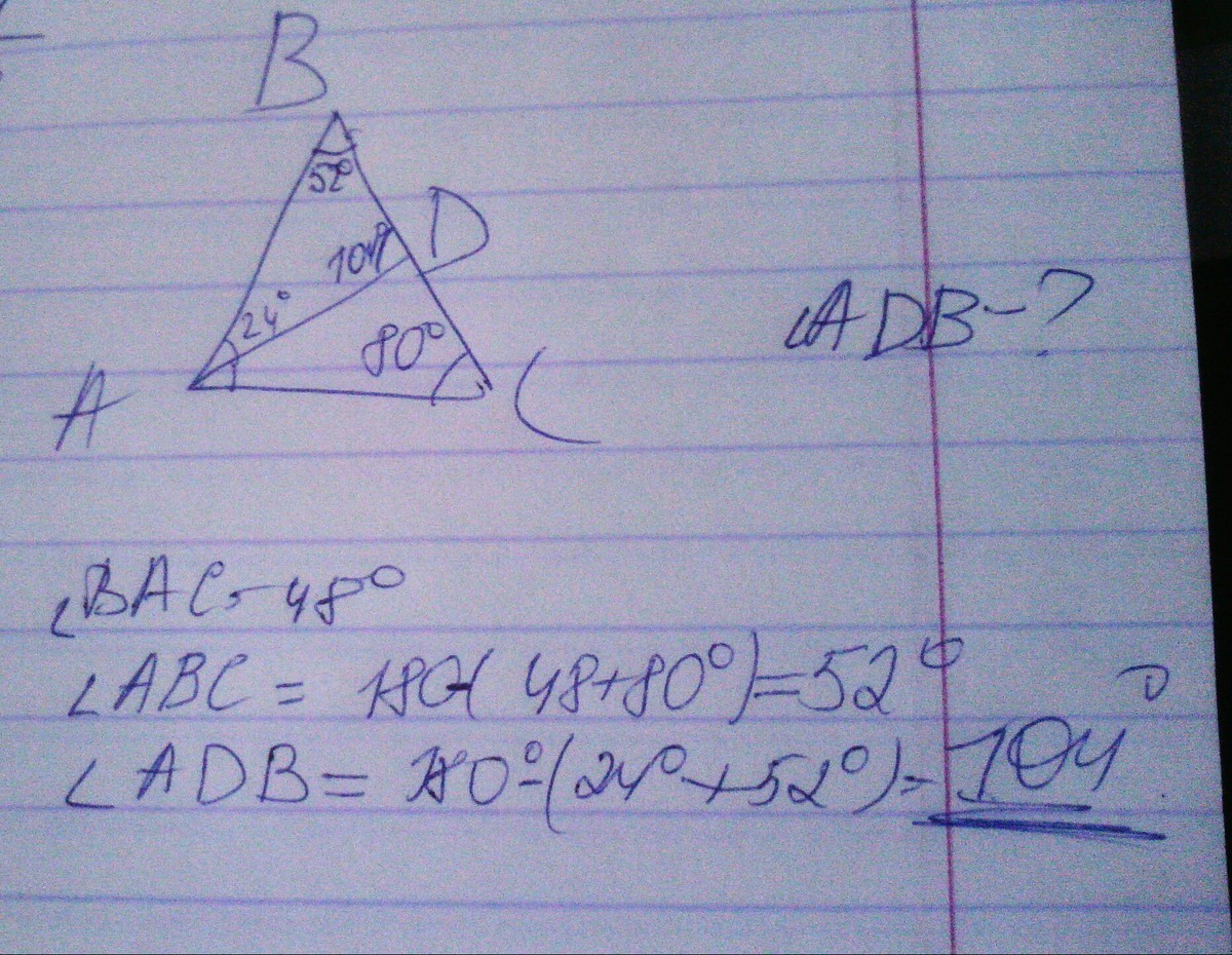 в треугольнике авс ад биссектриса, угол с равен 80, угол вад равен 24. Найти угол адв. Ответ дайте в градусах