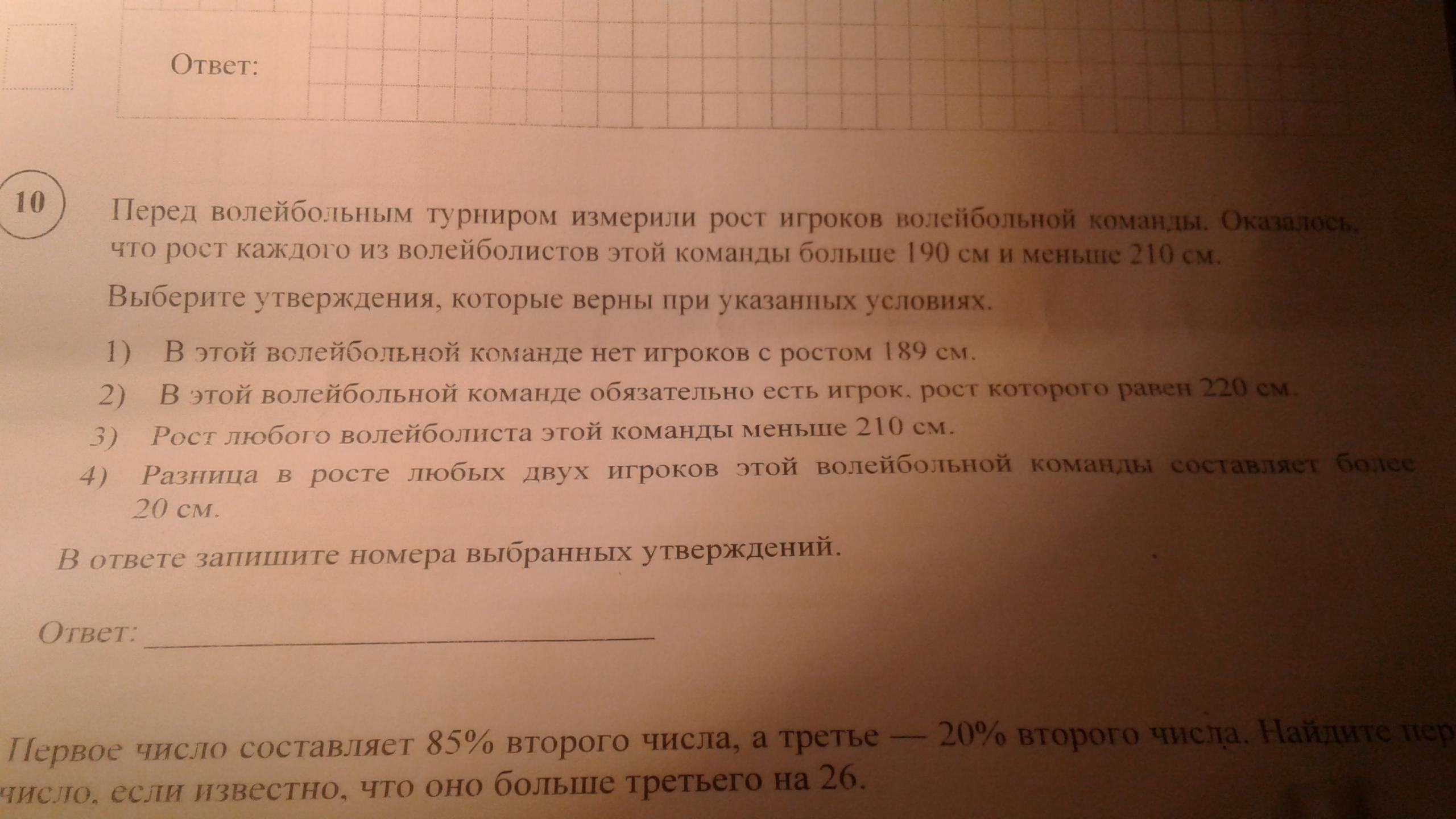 Перед волейбольным турниром измерили рост игроков волейбольной команды . Оказалось ,что рост каждого из волеболистов этой команды больше 190 см и меньше 220см 1) в этой волебольной команде нет игроков с ростом 189см 2)В этой волейбольной команде обязательно есть игрок , рост которого равен 220 см 3)рост любого волеболиста этой команды меньше 210см 4)Разница в росте любых двух игроков этой волебольной команды составляет более 20см .Решите пожалуста . Срочно