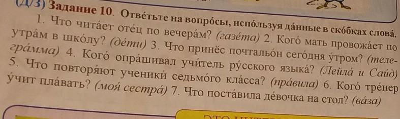 1 отец читает газету по вечерам 2 мама провожает детей по утрам в школу 3 почтальон принёс телеграмму утром 4 учитель русского языка опрашивал Лейлу и Саида 5 ученики седьмого класса повторяют правила 6 тренер учит мою сестру плавать 7 девочка поставила вазу на стол