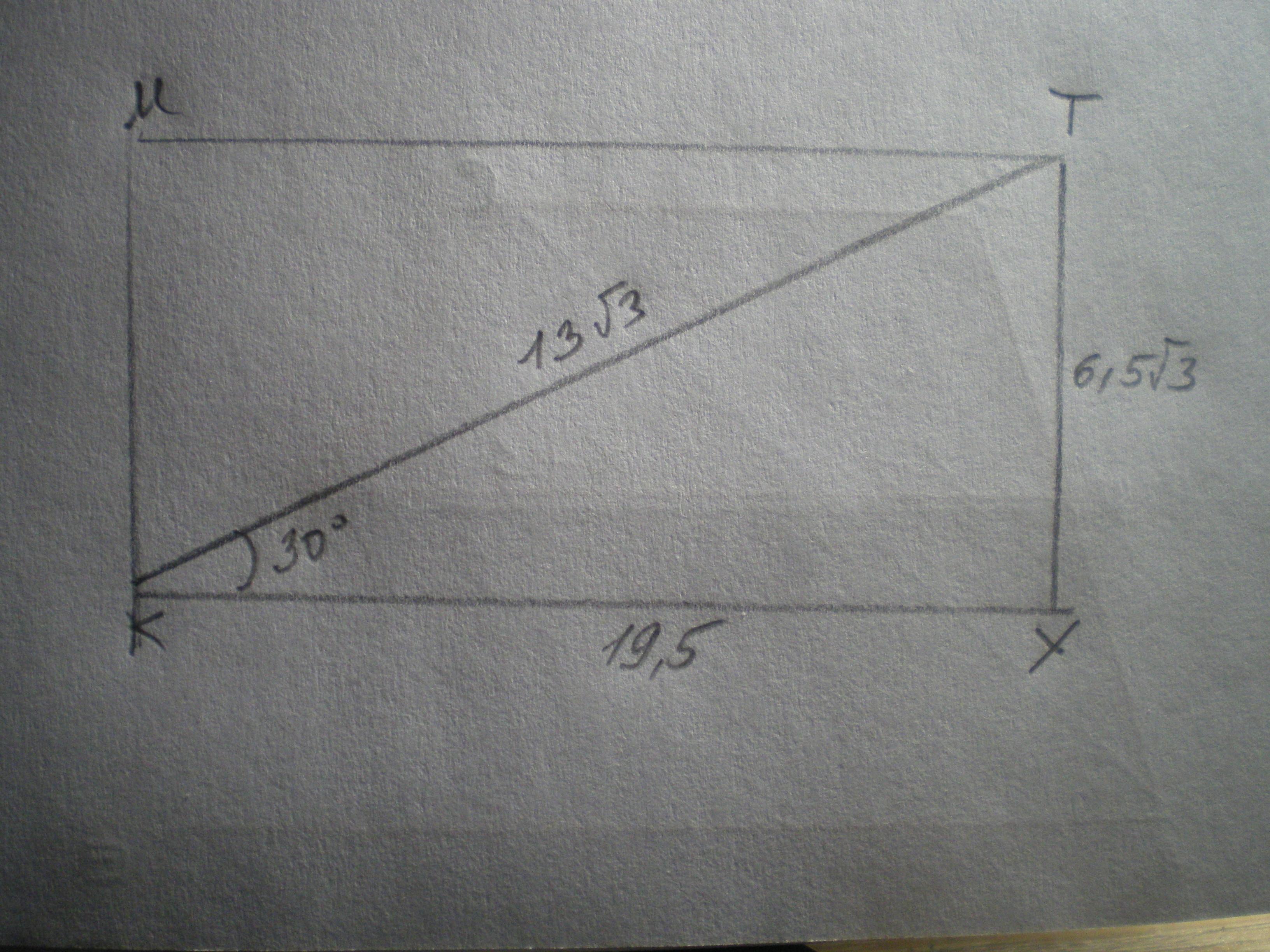 Дано: КМТУ - прямоугольник, КТ=13√3 см, ∠УКТ=30°. Найти: ТУ; КУ; S(КМТУ).