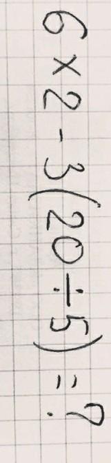 6 * 2 - 3(20 : 5) = 12 - 3 *4 = 12 - 12 = 0