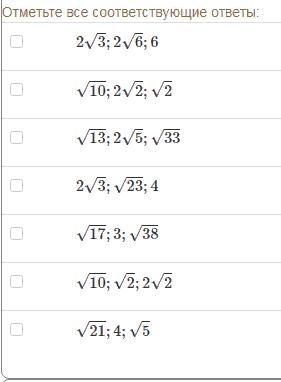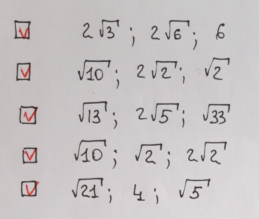 Заданы стороны треугольников. Выберите все прямоугольные треугольники. Отметьте все соответствующие ответы:
