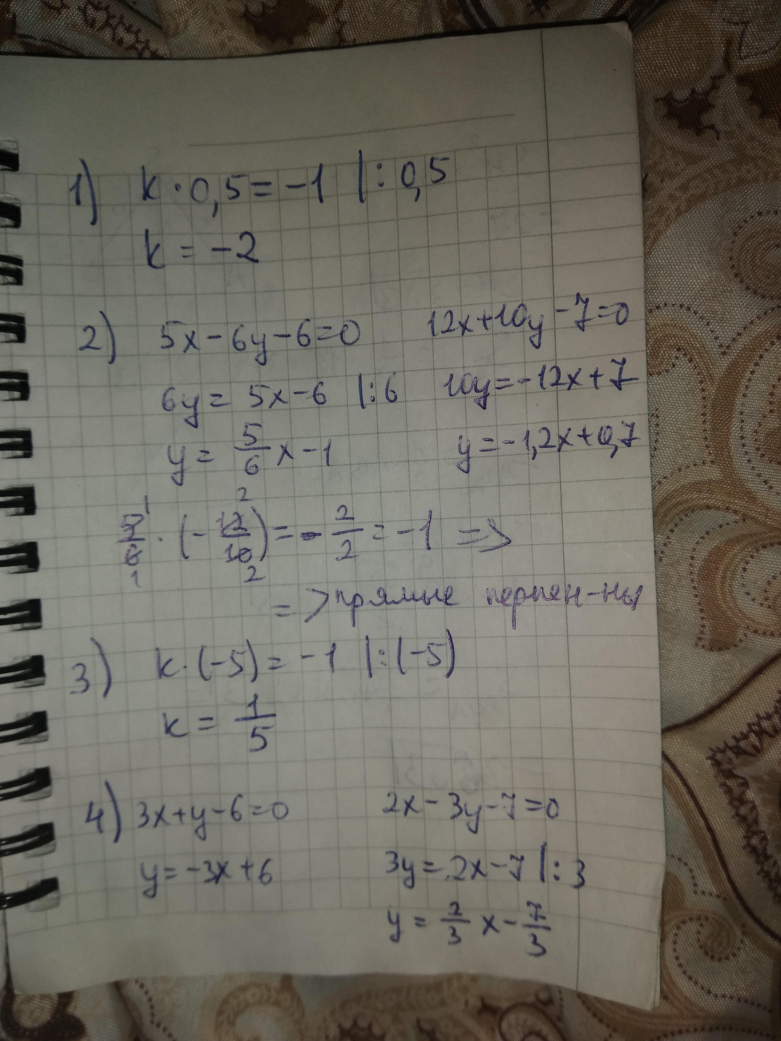 1) Прямая l1 задана уравнением с угловым коэффициентом. При каком значении углового коэффициента k прямая l2 : y = kx + b будет перпендикулярна прямой l1 : y = 0,5x – 4.