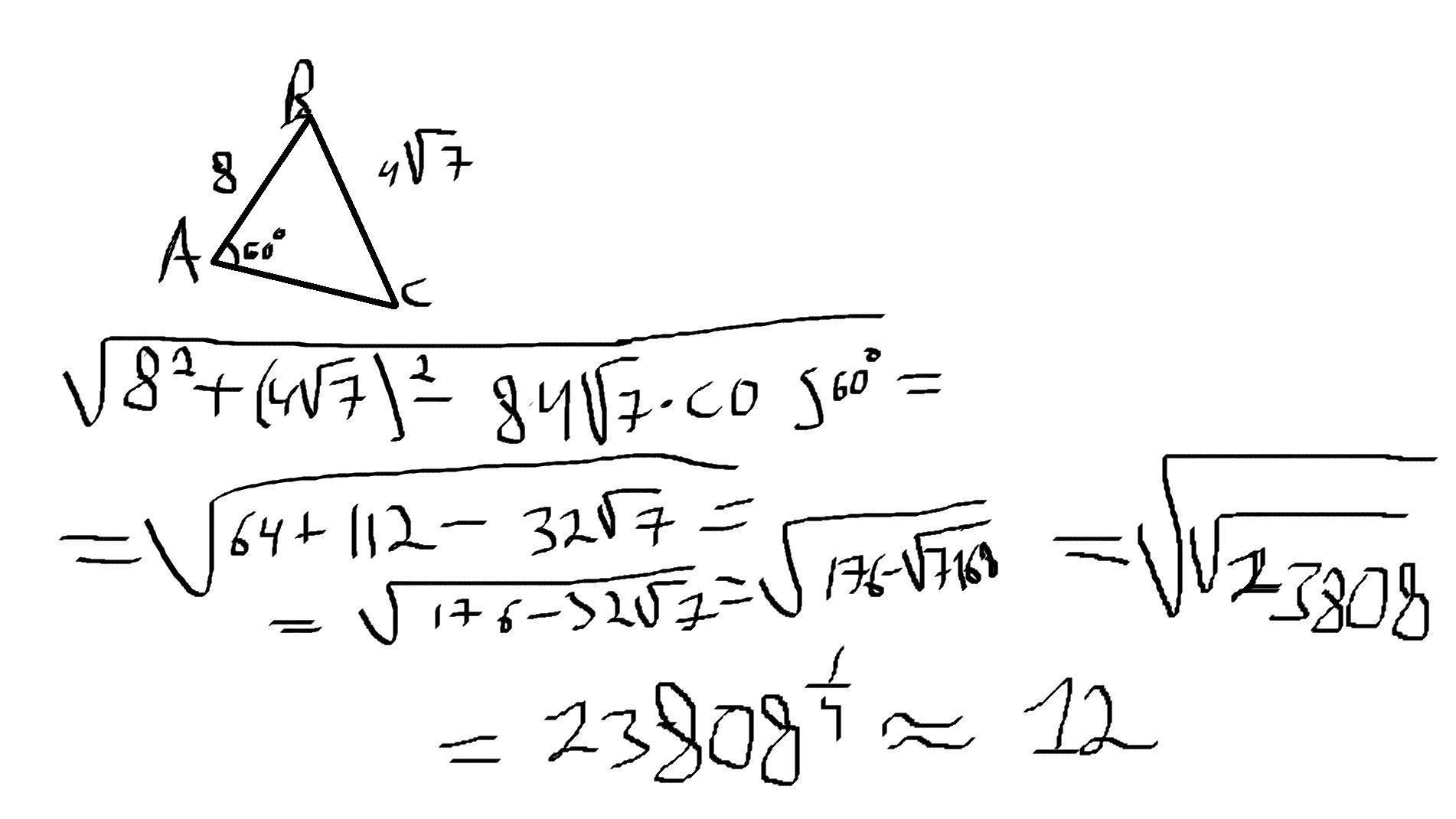 Двi сторони трикутника вiдповiдно дорiвнюють 8 см i4√7cм ,а кут ,що лежить проти большои з них дорiвнюе 60°.Знайдiть довжину третьои сторони .