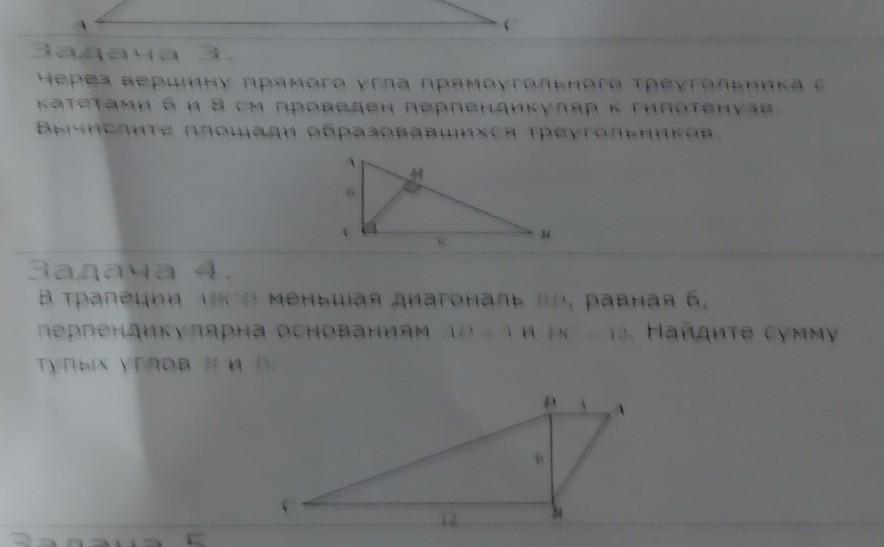 Найдём катет маленького треугольника, по теореме Пифагора он равен 3.6, Следовательно площадь м.треугольника равна: 3,6*6/2=10,8