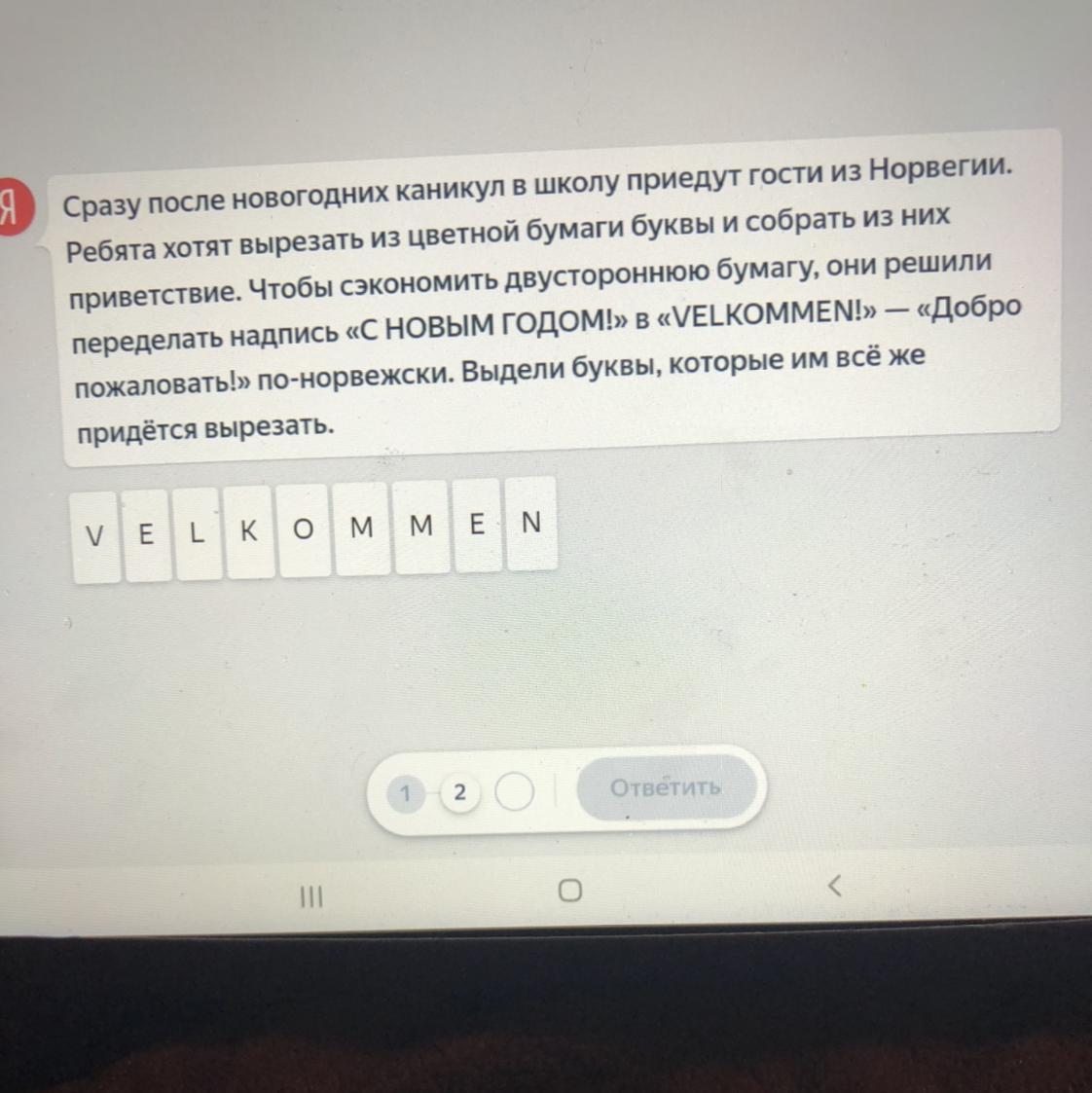 буквы которые придется вырезать,это НЕ ПОХОЖИЕ буквы в надписи "С НОВЫМ ГОДОМ!" и "VELKOMMEN",похожие буквы они не будут вырезать,а остальные нужно вырезать;V,E,K,N(ещё L не нужно вырезать так как Г если перевернуть это будет L)-эти буквы надо вырезать,а остальные буквы уже есть в надписи"С НОВЫМ ГОДОМ!"