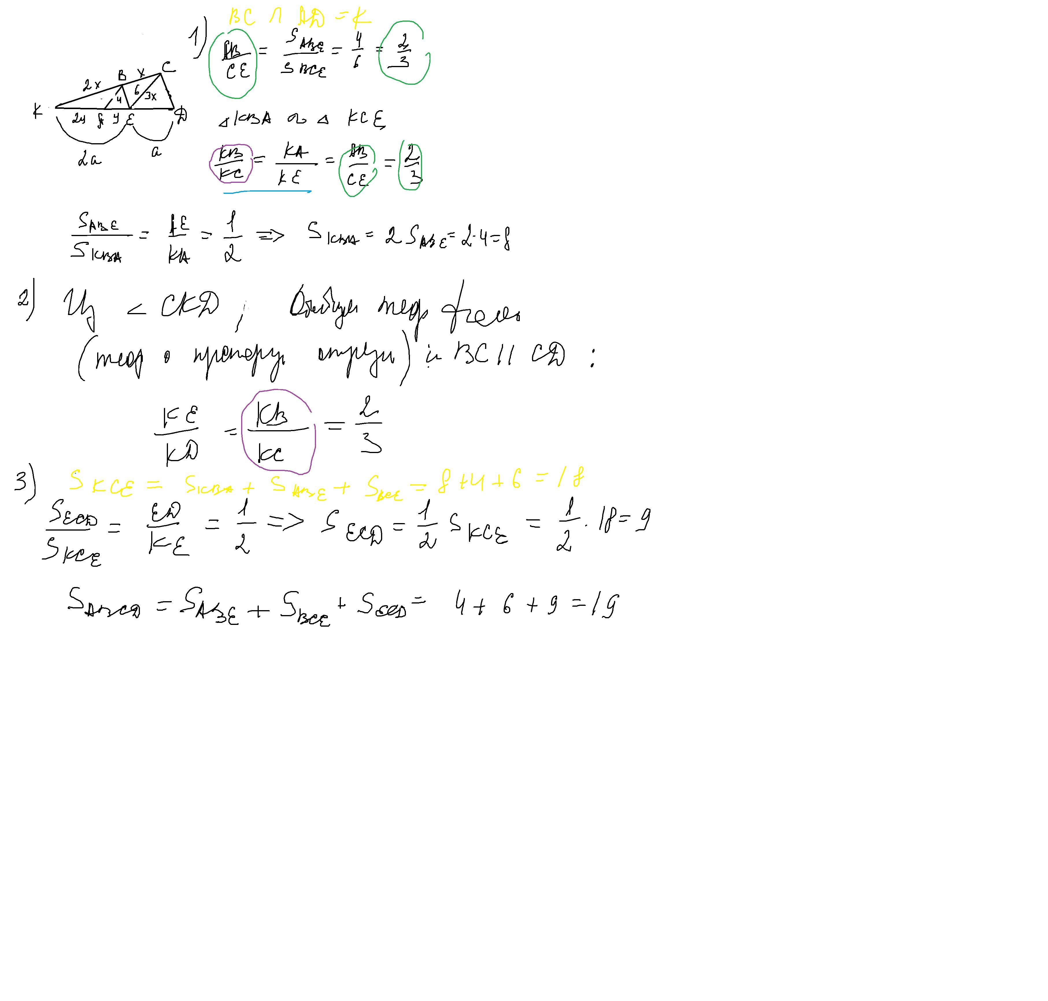 Через вершины b и c четырехугольника abcd провели параллельные сторонам cd и ab прямые, которые пересекаются на стороне ad в точке e. Найдите площадь четырехугольника abcd, если площади треугольников abe и bce равны соответственно 4 и 6.