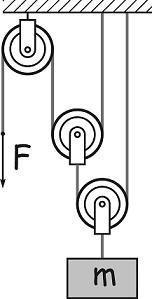 Найдите, какую силу F надо прикладывать к нити, чтобы система находилась в равновесии, если масса груза равна m=1 кг, а масса каждого блока равна 100 г. Ответ приведите в ньютонах. Ускорение свободного падения g=10 Н/кг. Нити невесомые. Ответ не 3 Н и не 2.75 Н .