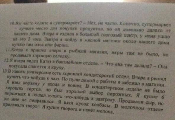 10)Do you often go to the supermarket? -No, not often, Of course, the supermarket is the best place to buy food, but it is quite far from our house. Yesterday I went to a large shopping center, it took me 2 hours. Tomorrow I will go to the butcher shop near our house to buy meat and minced meat there