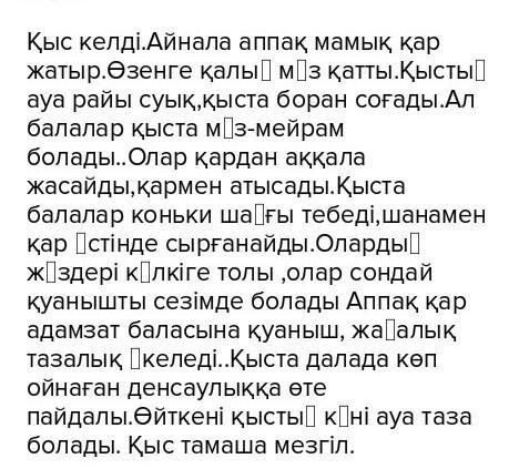 Қыс мезгіліне желтоқсан, қаңтар, ақпан айлары жатады. Қыста айнала аппақ қар, аяз. Ағаштарда аппақ қырау тұрады. Қыс мезгілінде айнала ерекше болады. Қыс мезгілінде шаңғы, коньки теуіп, шанамен сырғанап ойнаймыз. Жаңа жылды күтеміз. Шыршаны безендіреміз. Аяз атадан түрлі сыйлықтар алғымыз келеді. Жылдың әр мезгілінің өз ерекшеліктері бар.