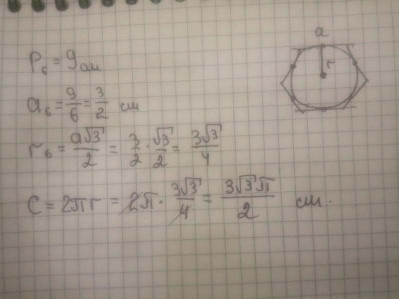 Найдите длину окружности, вписанной в правильный 6-угольник, если периметр этого 6-угольника 9 см.