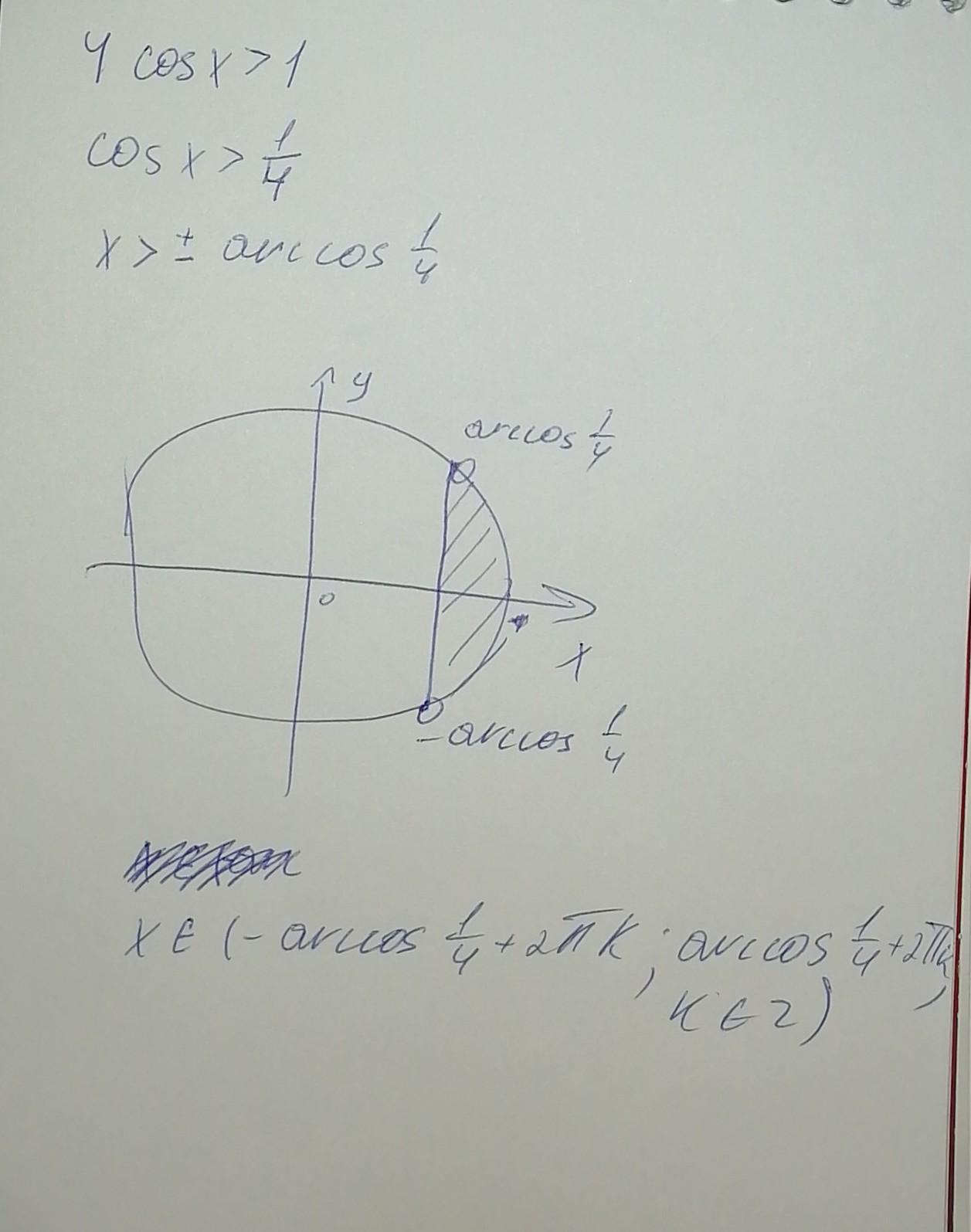 х € (-arccos 1/4 +2Пk; arccos 1/4 +2Пk, k€z)