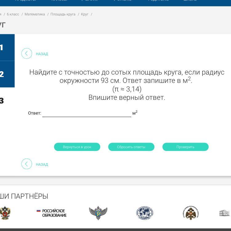 Подставляем в формулу S=3.14 * (0.93)^2≈2.715786