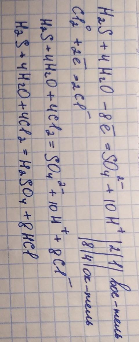 H2S(-2)+4Cl2(0)+4H2O--->H2S(+6)O4+8HCl(-)