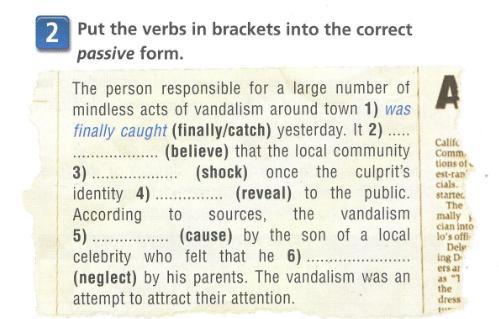 The person responsible for a large number of mindless acts of vandalism around town was finally caught. It is believed that the local community was shocked, once the culprit's identity was revealed to the public. According to sources, the vandalism was caused by the son of a local celebrity, who felt that he was neglected by his parents. The vandalism was an attempt to attract their attention.