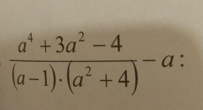 (a⁴+3a²-4)/((a-1)(a²+4)) -a=(a⁴+3a²+a²-a²-4)/(((a-1)(a²+4)) -a=((a⁴+4a²)-(a²+4))/((a-1)(a²+4)) -a=(a²(a²+4))/((a-1)(a²+4)) -1/(a-1) -a=(a²-1)/(a-1) -a=((a-1)(a+1))/(a-1) -a=a+1-a=1