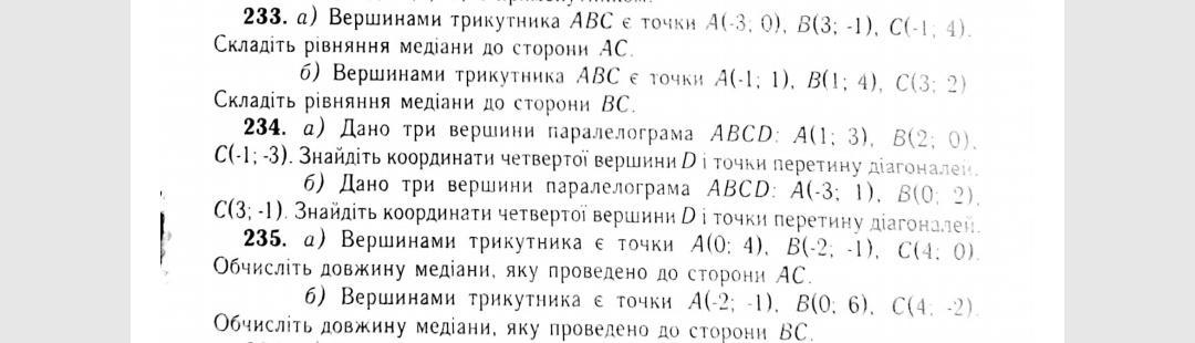 233 б) Медиана соединяет вершину треугольника с серединой противолежащей стороны. Следовательно, при решении задачи составления уравнения медианы нужно: