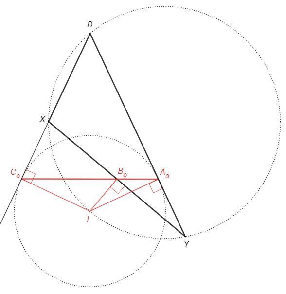 I - точка на окружности, описанной около треугольника XBY. IAo, IBo, ICo - перпендикуляры, опущенные на стороны треугольника XBY. Основания перпендикуляров Ao, Bo, Co лежат на прямой Симсона.