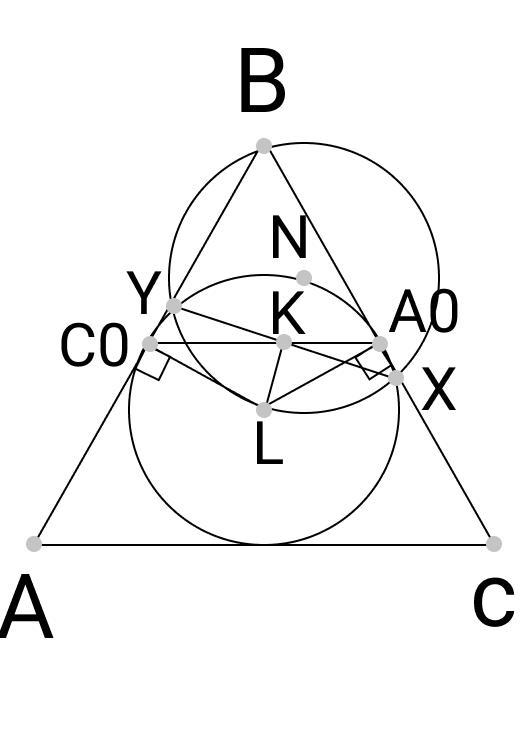 Помогите решить задачу: Окружность с центром I, вписанная в треугольник АВС, касается сторон АВ и ВС в точках С0 и А0 соответственно. Окружность, проходящая через точки В и I, пересекает стороны АВ и ВС в точках X и Y. Докажите, что середина отрезка XY лежит на прямой А0С0.