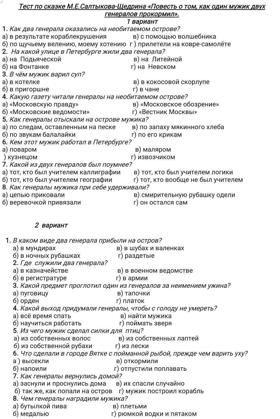 Тест по сказке М.Е.Салтыкова-Щедрина «Повесть о том, как один мужик двух генералов прокормил».