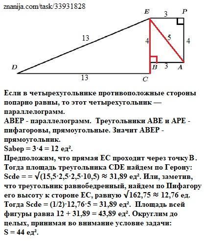 Sabep = 3·4 = 12 ед². Предположим, что прямая ЕС проходит через точку В. Тогда площадь треугольника CDE найдем по Герону: Scde = √(15,5·2,5·2,5·10,5) ≈ 31,89 ед². Или, заметив, что треугольник равнобедренный, найдем по Пифагору его высоту к стороне ЕС, равную √162,75 ≈ 12,76 ед. Тогда Scde = (1/2)·12,76·5 = 31,89 ед². Площадь всей фигуры равна 12 + 31,89 = 43,89 ед².