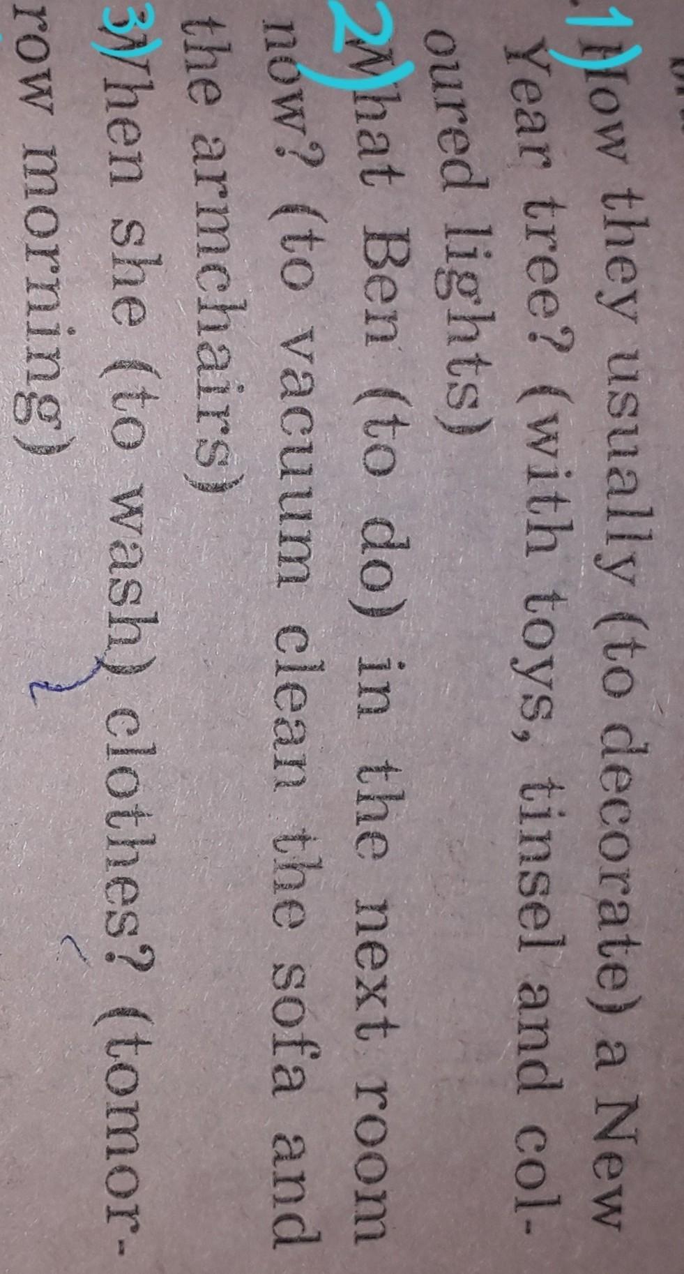 1. How do they usually decorate a New Year tree? - They decorate it with toys, tinsel, and coloured lights.