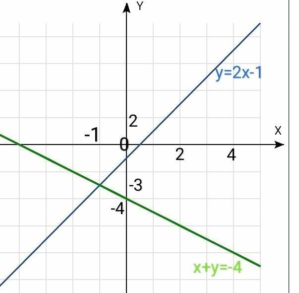 Обратите внимание на то, что единичные отрезки на осях х и у у меня различные. Вы можете их изобразить в своей работе равными. Главное - верно отметить точки из таблицы и построить прямые. Точка пересечения должна получиться (-1; -3). Была рада помочь!