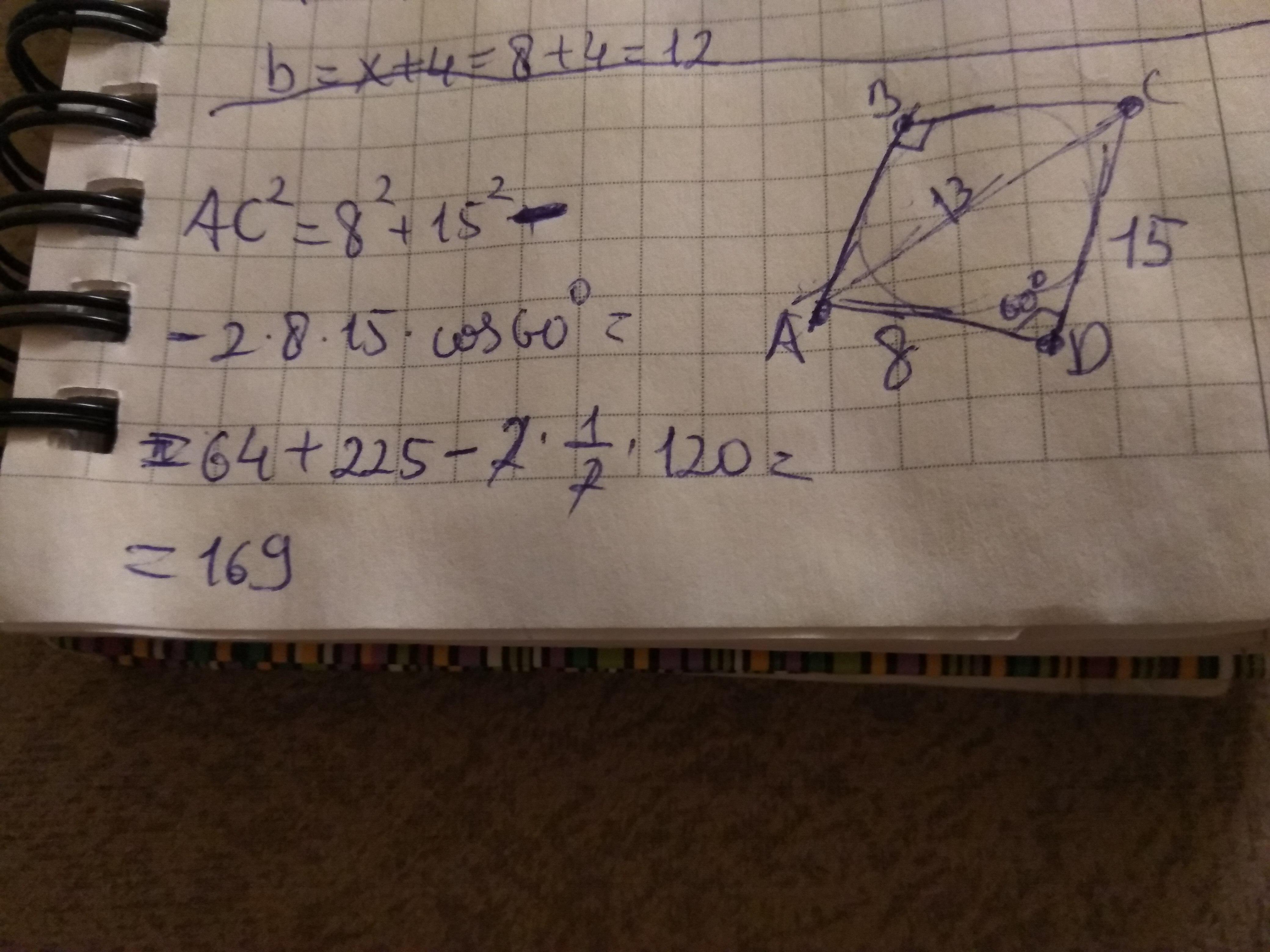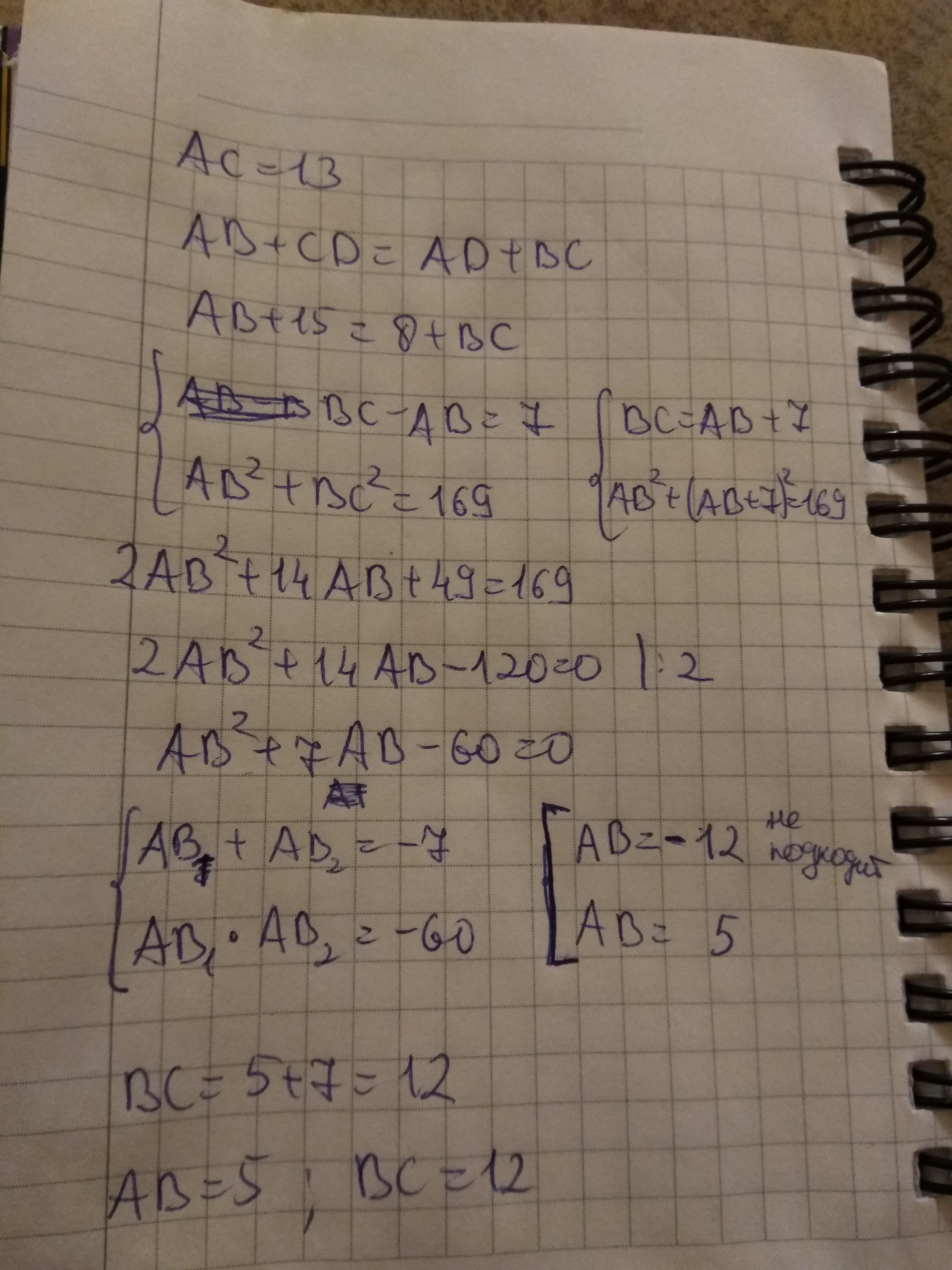 Четырехугольник ABCD описан около окружности. Найдите AB и BC, если угол ABC=90°,ADC=60°, AD=8 см, CD=15 см