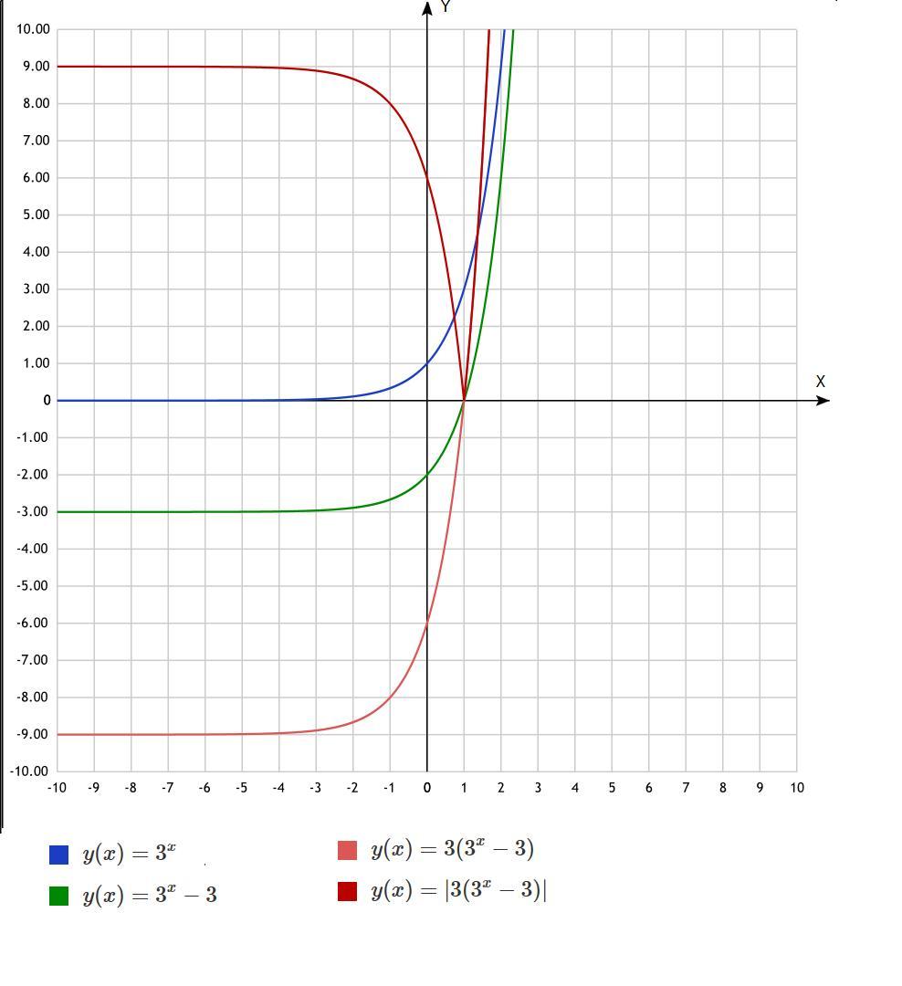 оранжевый-растягиваю зеленый график по оси у в 3 раза, получаю график y=3(3^x-3)