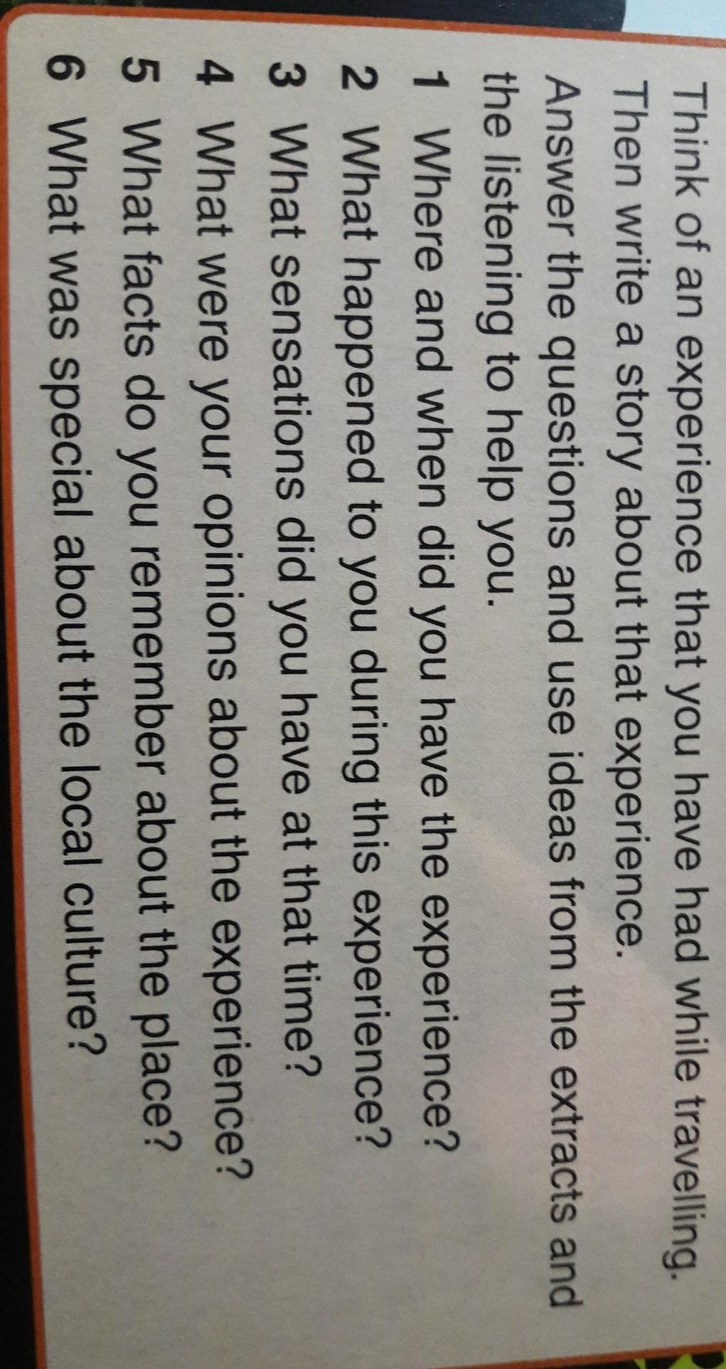 Think of an experience that you have had while travelling. Then write a story about that experience. Answer the questions and use ideas from the extracts and the listening to help you.(photo) (+-170 words)