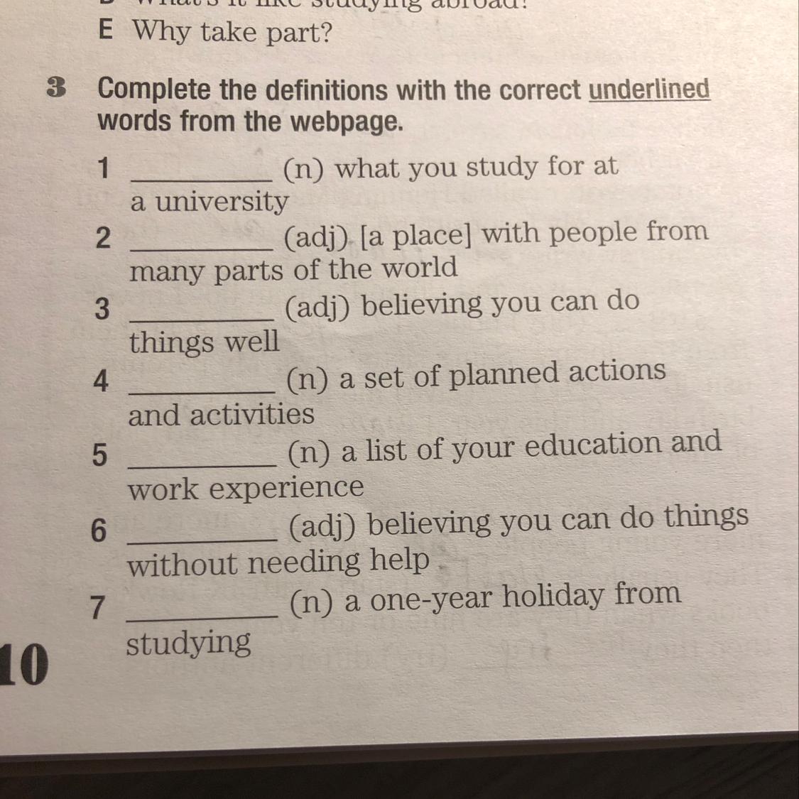 1. Degree - what you study for at university. 2. Cosmopolitan - (city ) with people from many parts of the world. 3 Confident - believing you can do things well. 4. Programme - a set of planned action and activities. 5. CV - a list of your education and work experience 6. Independent - believing you can do things without needing help. 7. Gap Year - one-year holiday from studying.