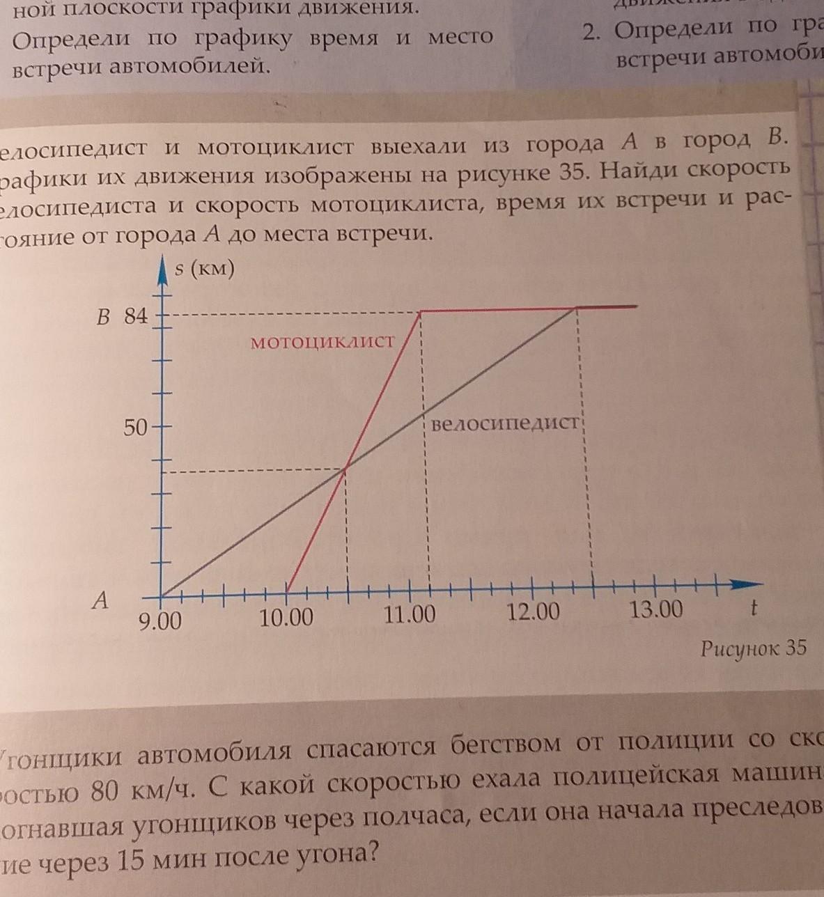 Графики их движения изображены на рисунке 35. Найди скорость велосипедиста и скорость мотоциклиста, время их встречи и расстояние от города А до места встречи. - помогите пожалуйста!!