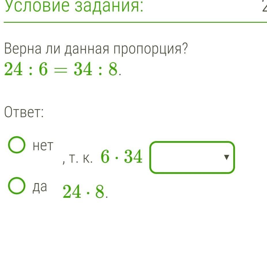 Нет, данная пропорция не верна, т. к. 6×34=204, а 24 ×8=192, поэтому тут нет основного свойства пропорции.
