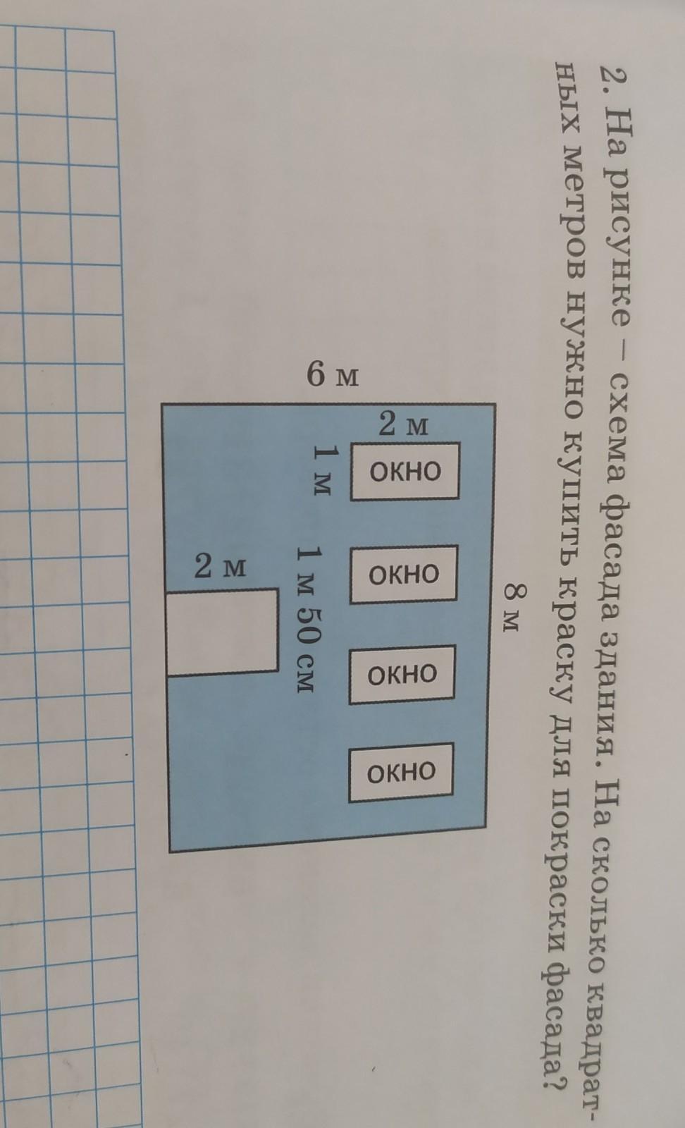 48 м2-8 м2-3 м2=37 м2. Купить краску нужно на 37 квадратных метров. От площади всего прямоугольника отнимаем площади 4 окон и дверей.