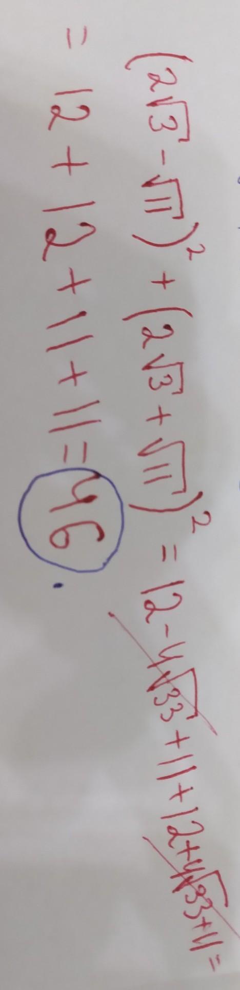 (2√3-√11)²+(2√3+√11)²= 4×3-2×2√33+11+4×3+2×2√33+11= 12-4√33+11+12+4√33+11= 12+11+12+11= 46.