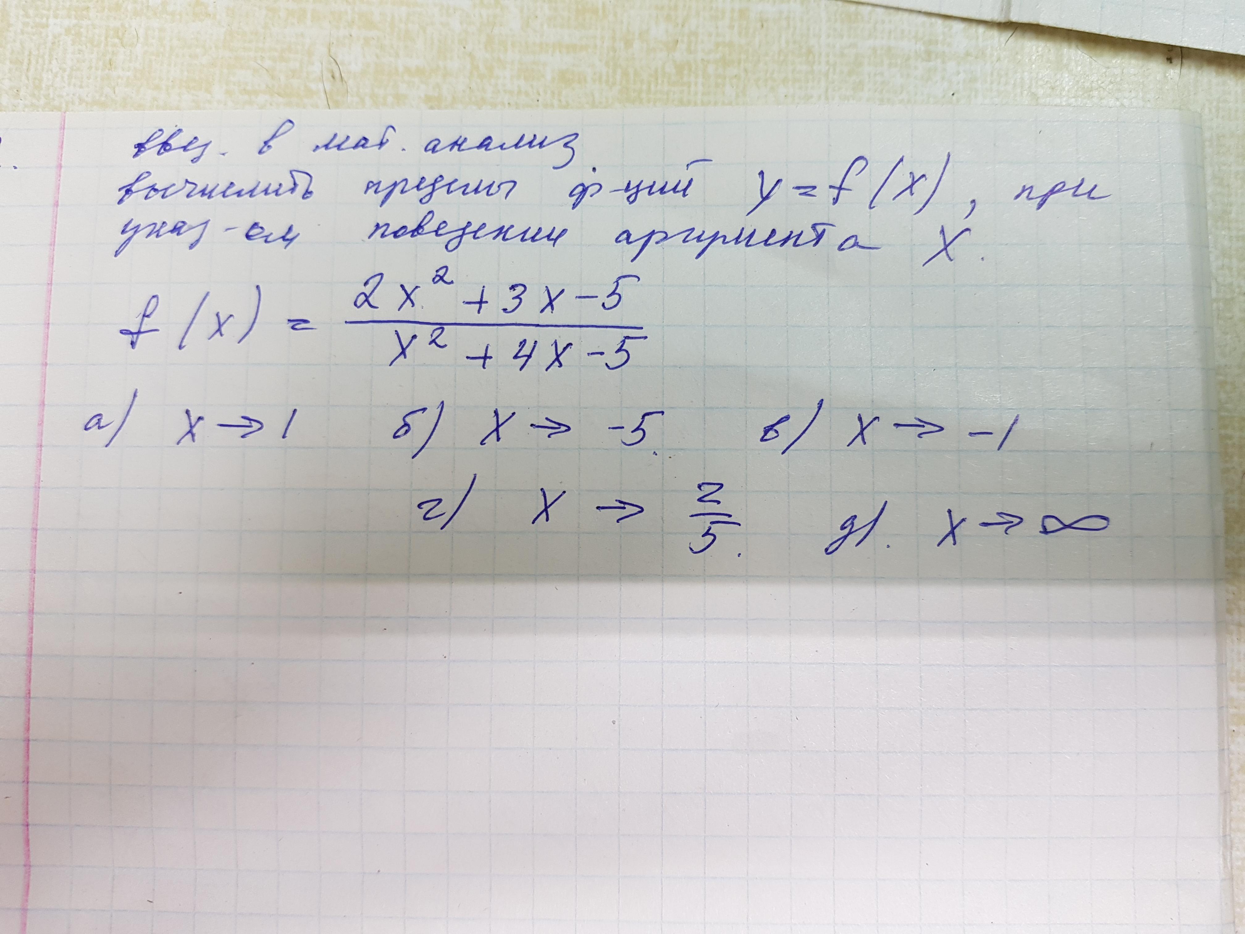 сделаем сначала x->∞ lim(x->∞) (2x² + 3x - 5)/(x² + 4x - 5) = делим на х² числитель и знаменатель = lim(x->∞) (2 + 3/x - 5/x²)/(1 + 4/x - 5/x²) = (2 + 0 - 0)/(1 + 0 - 0) = 2