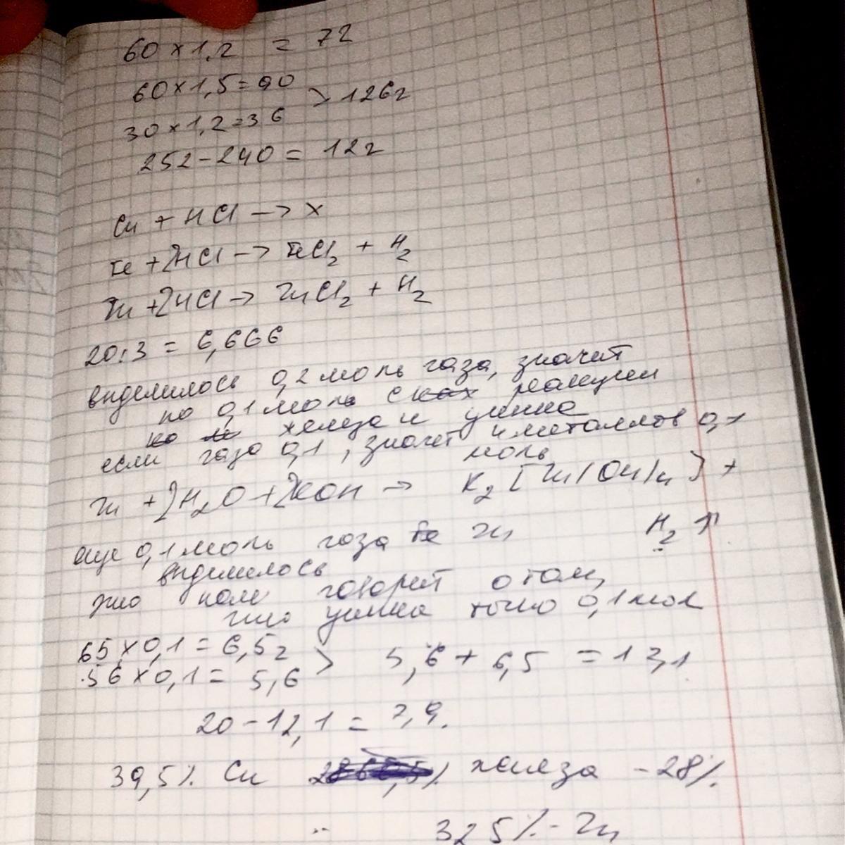 При действии избытка HCl на 20 г смеси (Cu Fe Zn) выделилось 0,2 моль газа, а при обработке такого же количества смеси избытком раствора KOH выделилось 0,1 моль газа. Найдите процентный состав метталов.