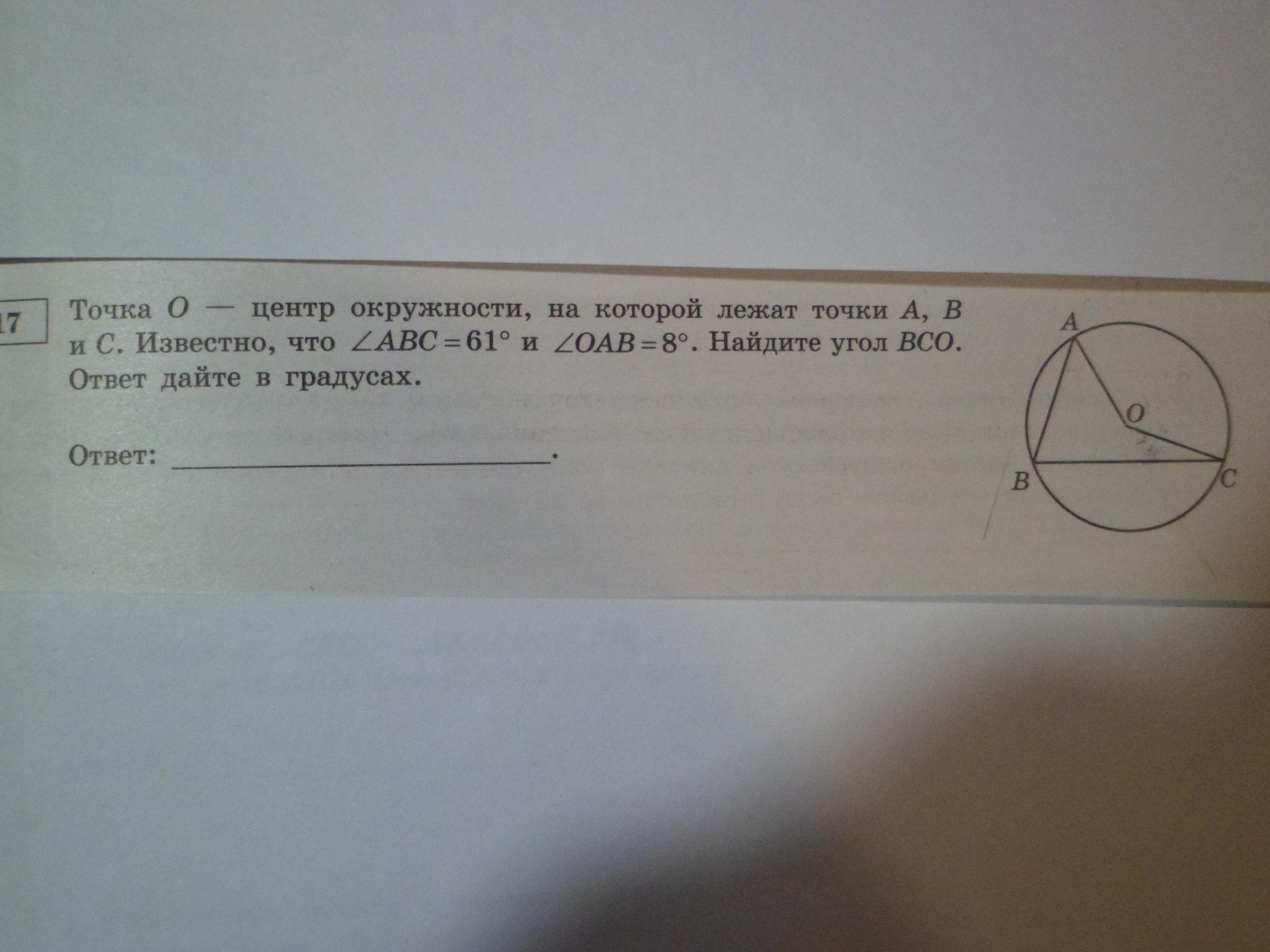 Проведём радиус OB. Рассмотрим треугольник AOB: AO = OB, следовательно, углы ∠OAB = ∠ABO = 8°. Рассмотрим треугольник BOC: BO = OC, следовательно, ∠BCO = ∠OBC = ∠ABC − ∠ABO = 61° − 8° = 53°.