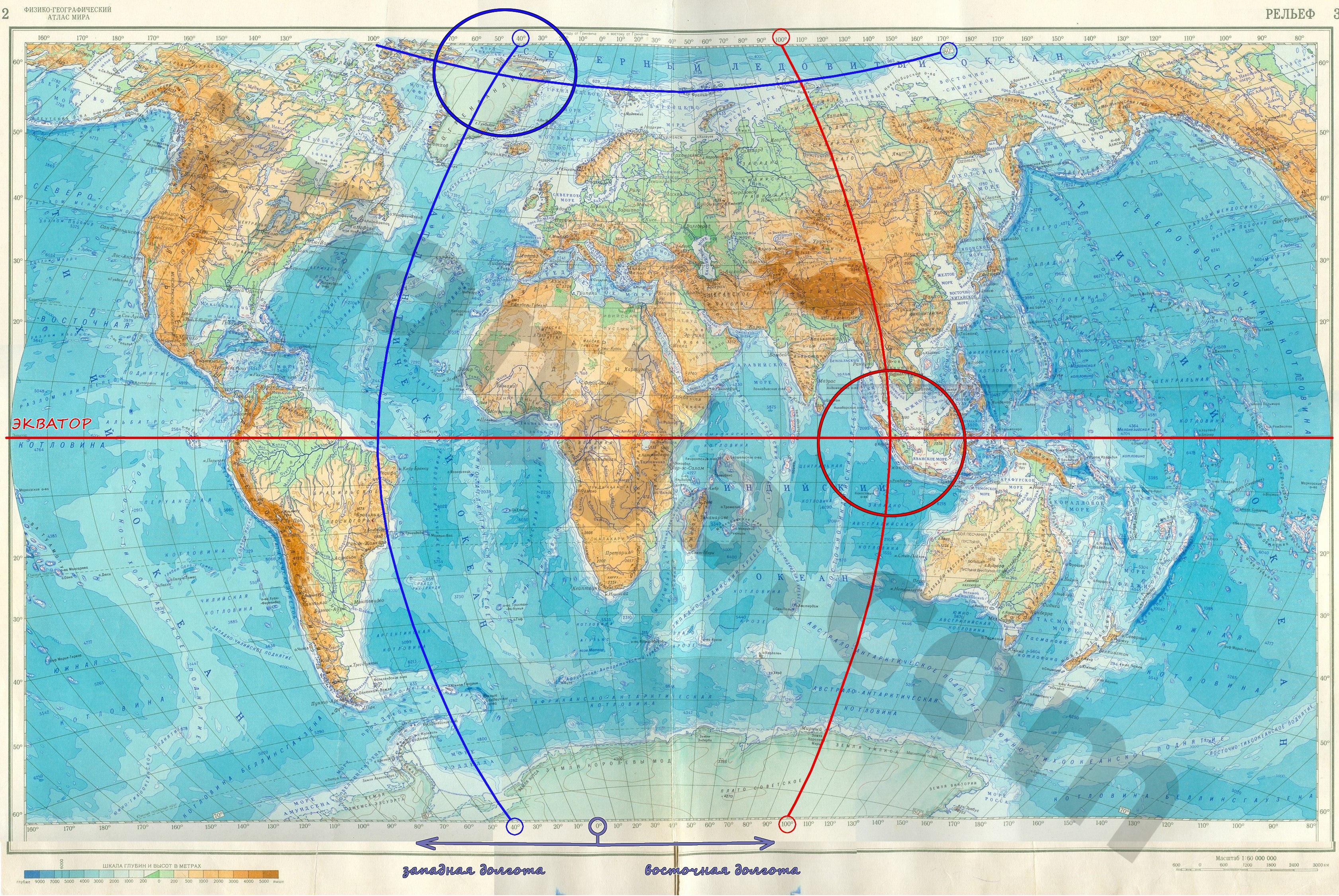 1) экватор и 100° в.д. (отмечены на карте красным), точка пересечения попадает на территорию острова Суматра.